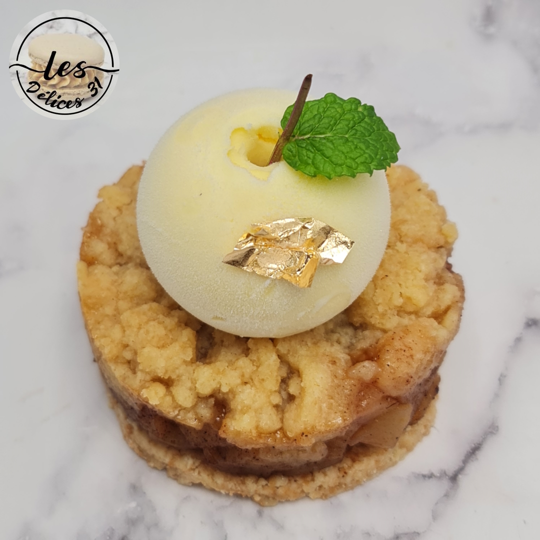 Apple crumble Apple crumble with– sweet pâté,– diced apples with cinnamon,– pecan crisp,– vanilla ice cream. Material used– 6-cavity silikomart cylinder mould– Tefal baking tray– Baking paper– Silikomart truffle mould x15– Circular cookie cutter IngredientsSweet dough150g flour60g sugar60g brown sugar110g butter Cinnamon powderPecan crisp50g Pecan Praline40g white chocolate30g Crêpes dentelles Vanilla ice cream2-3 Golden applesPowdered sugarCinnamonA little water For 4 to 5 crumblesPecan crumble50g Pecan Praline40g white chocolate30g Crêpes dentellesMelt the white chocolate in the microwave. Add crumbled crêpes dentelles and pecan praline. Mix gently. Roll out between two sheets of baking paper and place in the freezer. Remove from freezer and cut out using a cookie cutter. Place in freezer. Sweet dough150g flour60g sugar60g brown sugar110g butter Cinnamon powderMix all ingredients with your fingers. Fry the apples, cut into small pieces, in a saucepan with a little caster sugar, cinnamon and a tiny splash of water until golden brown. Divide the diced apples among the silikomart cylinder moulds, leaving room for the crumble mixture. Spread the crumble batter over the top and bake at 180°C for around 10-15 minutes. Leave to cool, then place each crumble on a disc of pecan praline crumble. Fill the silikomart truffle mould with vanilla ice cream, packing the ice cream well. Unmold and place on top of crumble just before serving.I decorated with a mint leaf and a small sheet of edible gold.