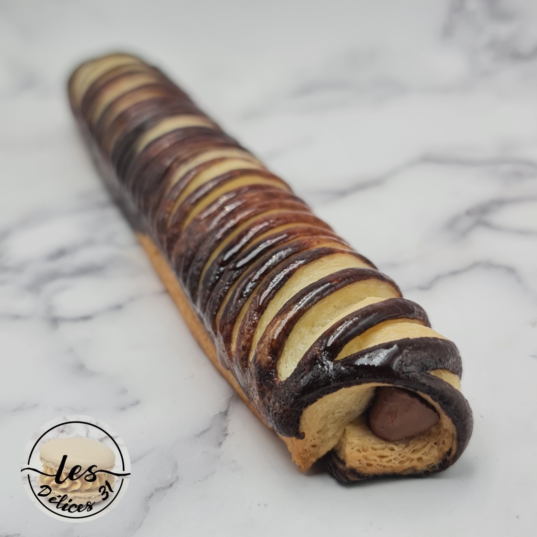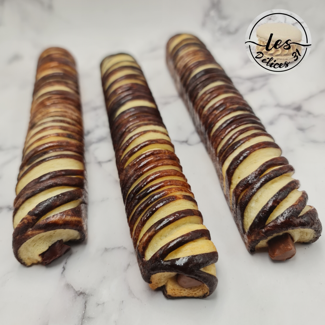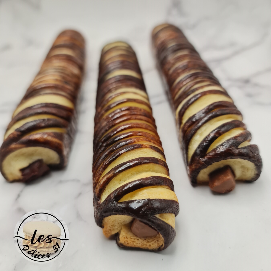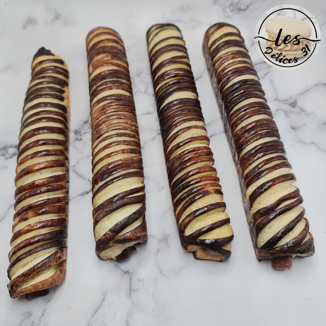 Déposer 6 bâtons de chocolat par rectangle de pâte puis rouler les pains au chocolat sans trop serrer la pâte.