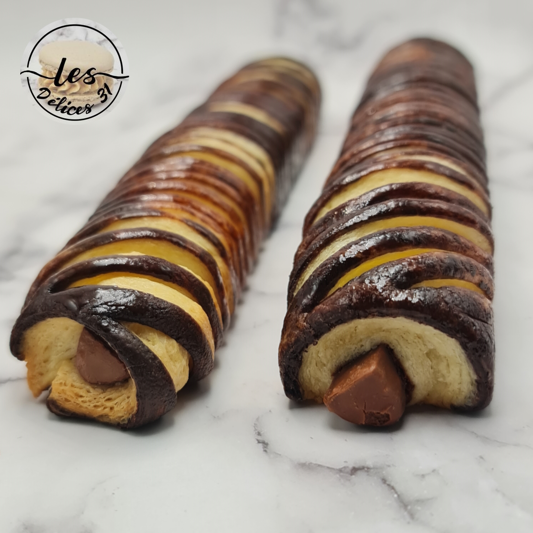 Mélanger la farine, le sel, le sucre, la levure, le beurre, l’eau et le le lait dans le bol du robot. Mélanger une dizaine de minutes. Travaillez un peu la pâte à la main. Prélever 90g pour réaliser la détrempe cacao..