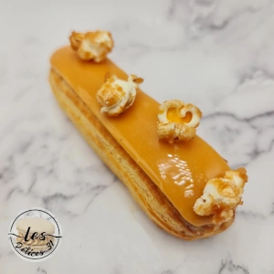 Remove the crème pâtissière from the fridge. Loosen it a little with a spatula, then fill a pastry bag fitted with a pastry tip. Make two small holes under each éclair and top with cream. Top each éclair with fondant. Decorate with caramelized popcorns at the last minute, before serving, otherwise they will soften in the fridge.