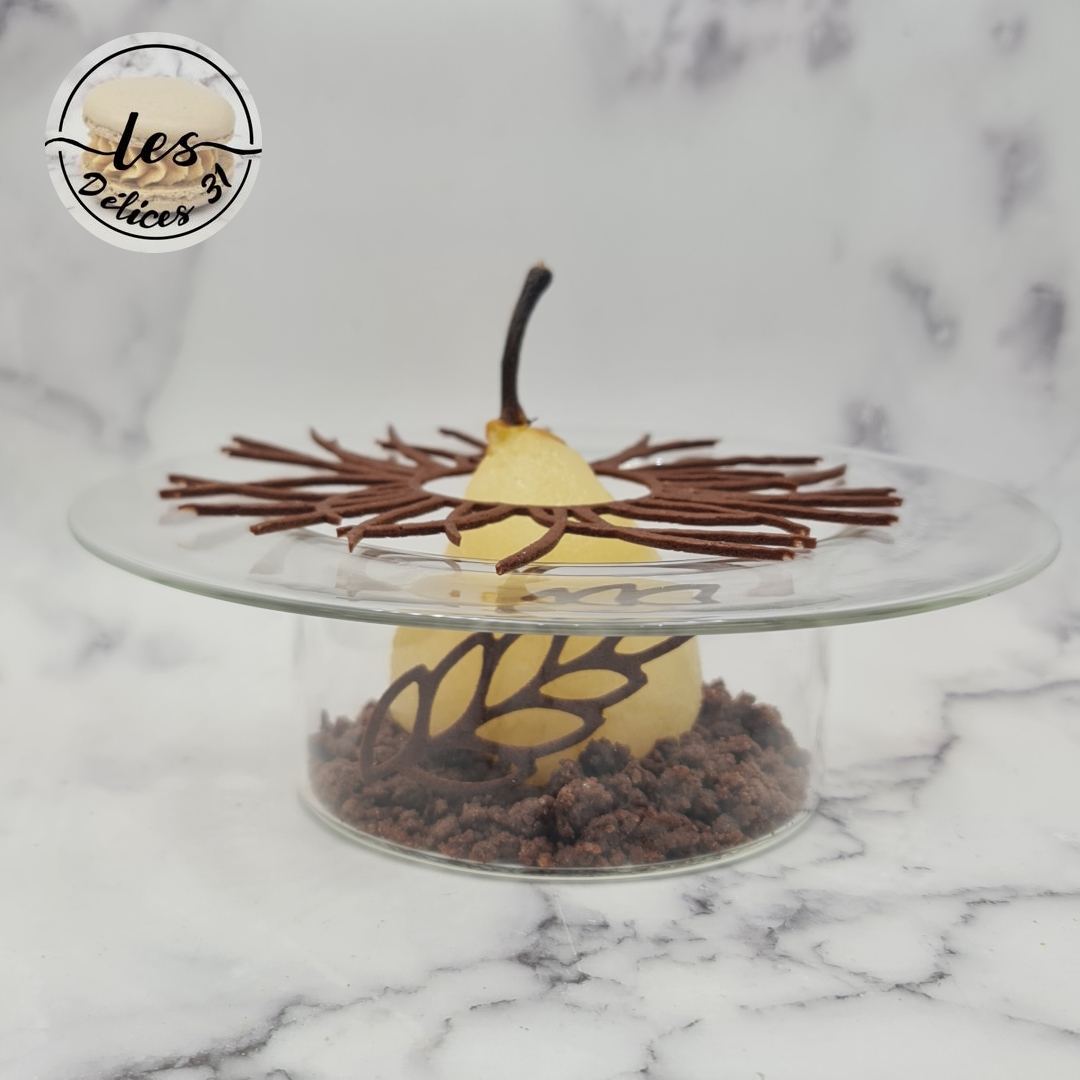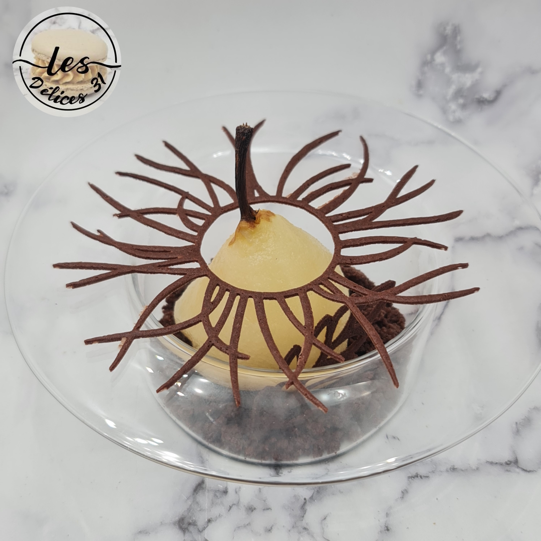 Place the poached pear, well drained, in the centre of your plate. Fill the surrounding area with sweet cocoa pastry. Place the cocoa tuile on top.