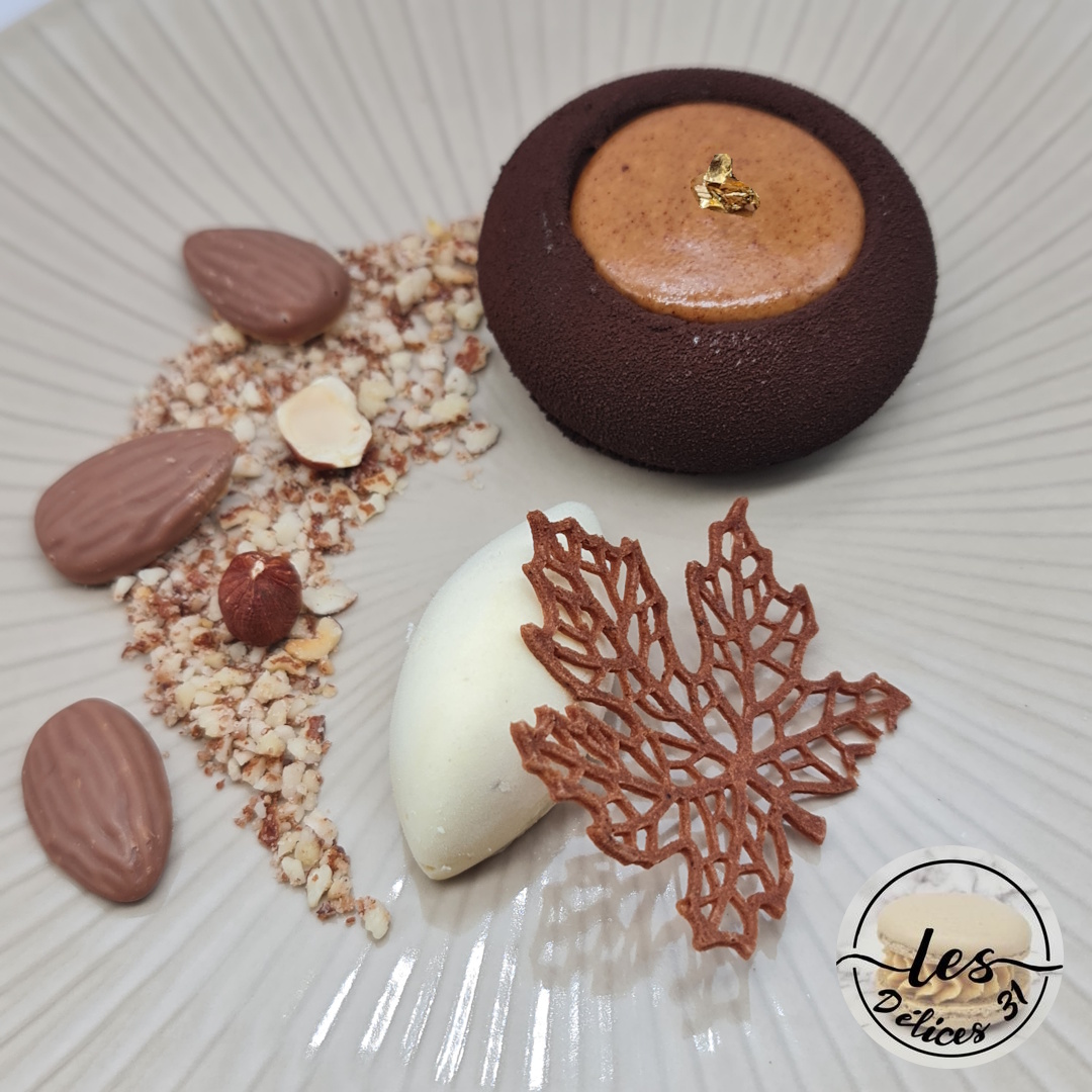 Remove the desserts from the moulds and immediately apply the brown velvet spray.