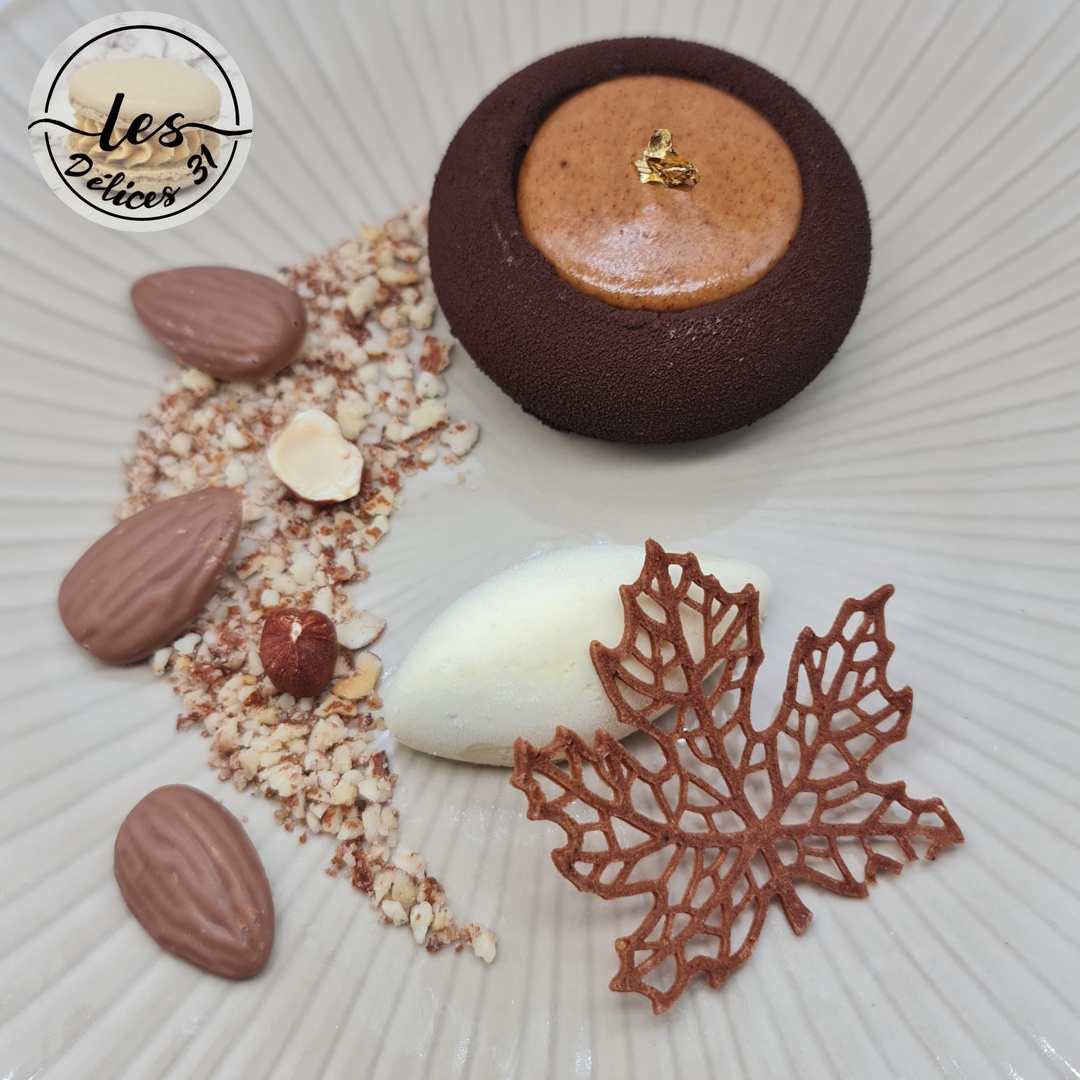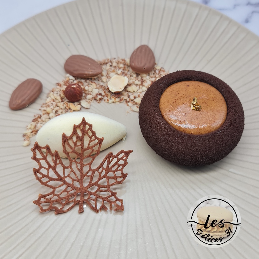 The next day, remove your desserts from the moulds and immediately apply the caramel velvet spray.