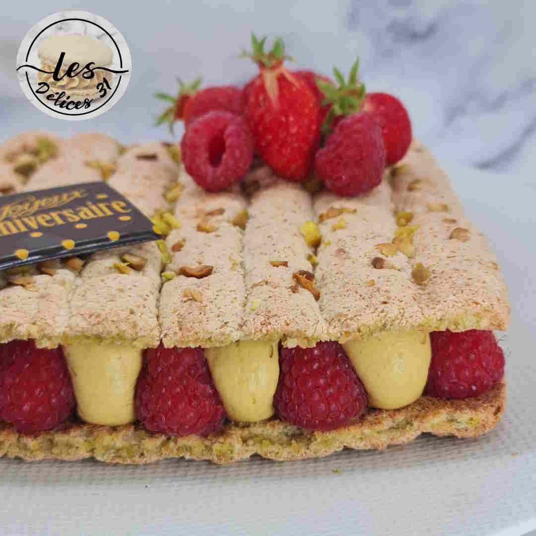 Place the second dacquoise biscuit (the one covered with chopped pistachios) on top.
