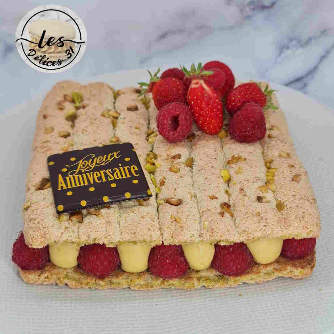 Pipe on some mousseline cream, a few strawberries cut into pieces, some cream, the second sponge cake layer soaked in syrup and finish with a little cream. Smooth the surface with an offset spatula, then chill for at least 4 hours to allow the butter to set and give your strawberry cake its structure.