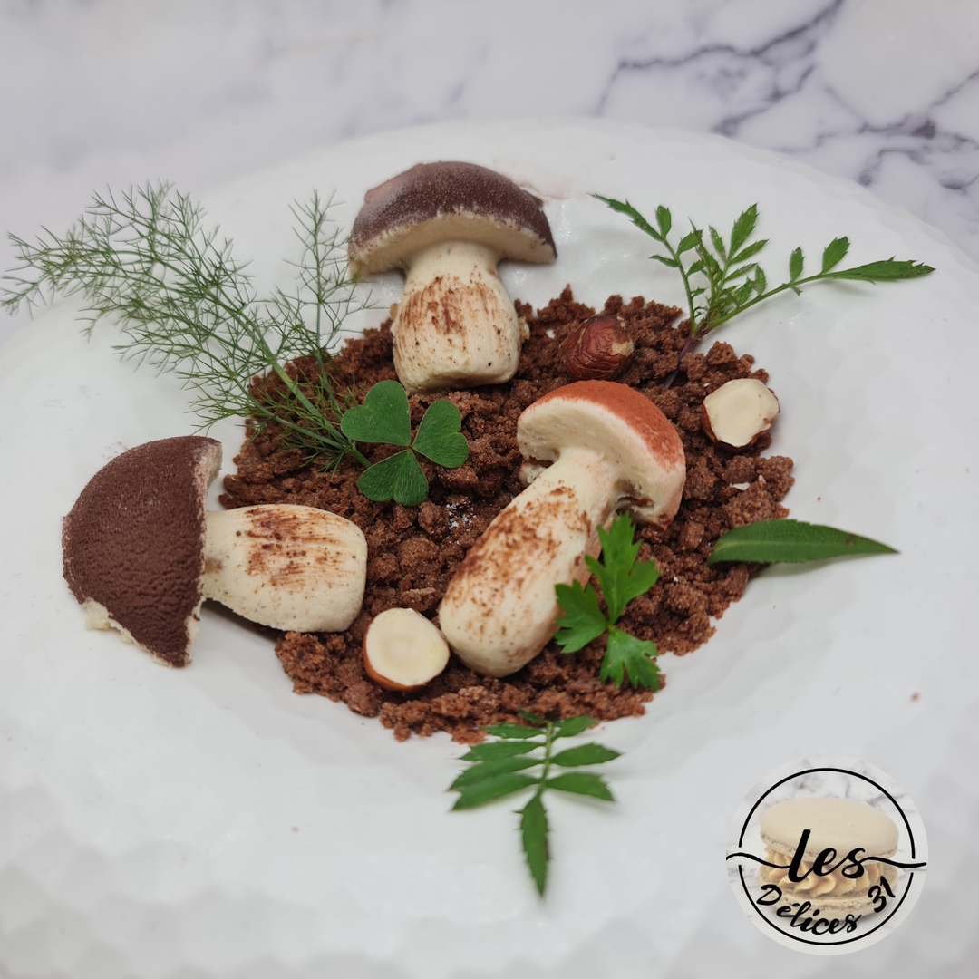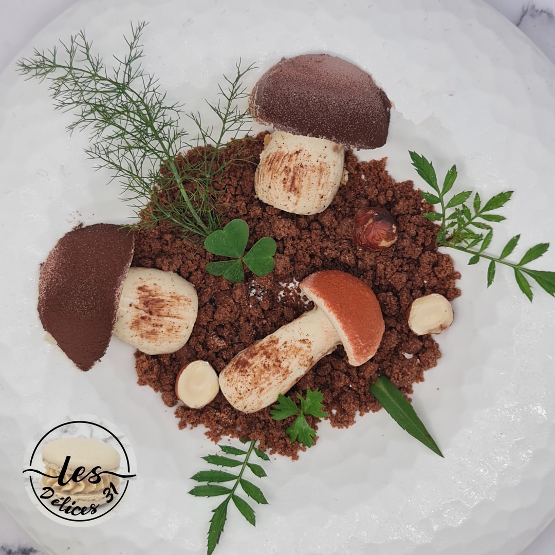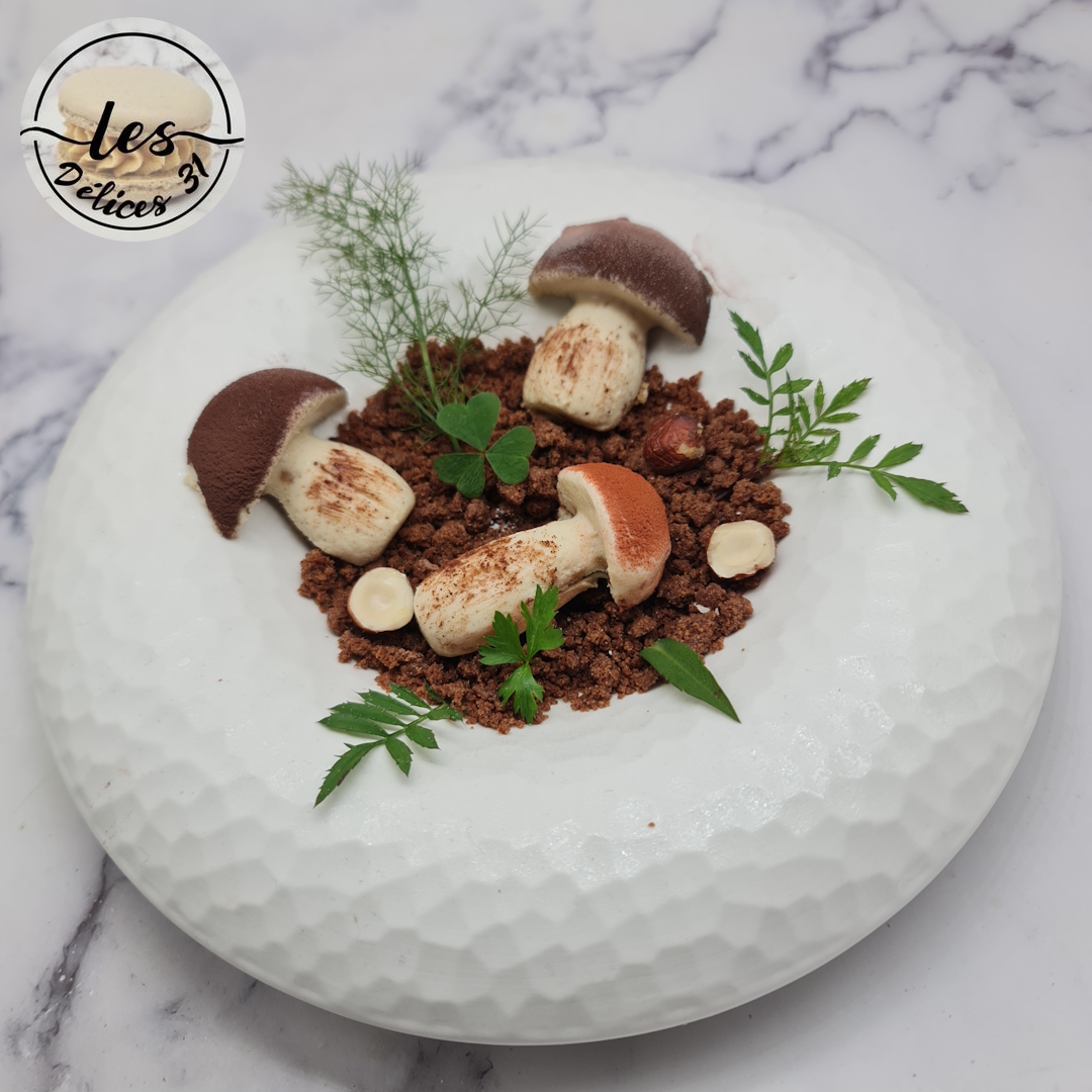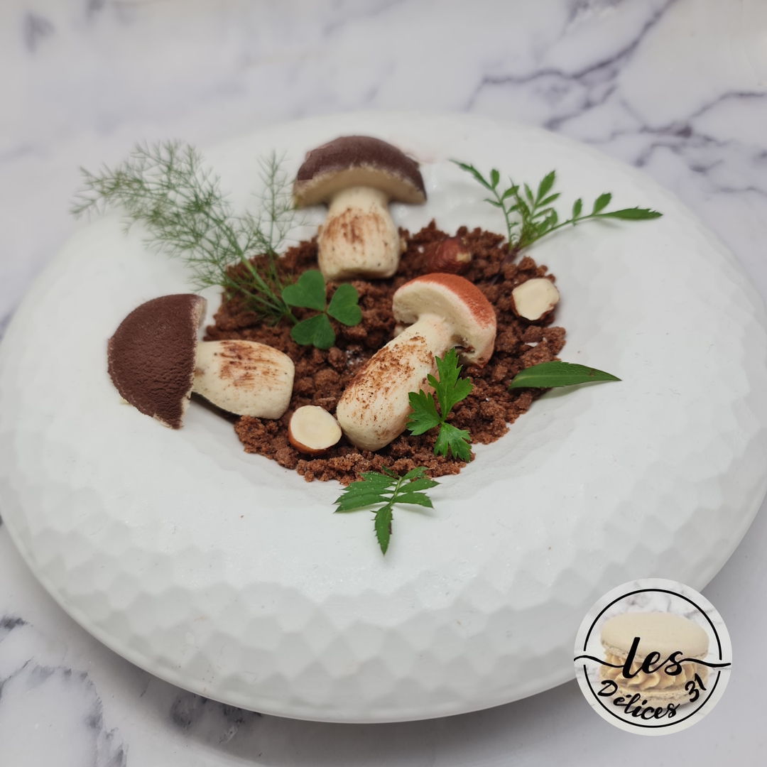 Disposez dans vos assiettes de service de la pâte sucrée cacao. Déposez vos entremets. J’ai décoré avec quelques noisettes et herbes du jardin.