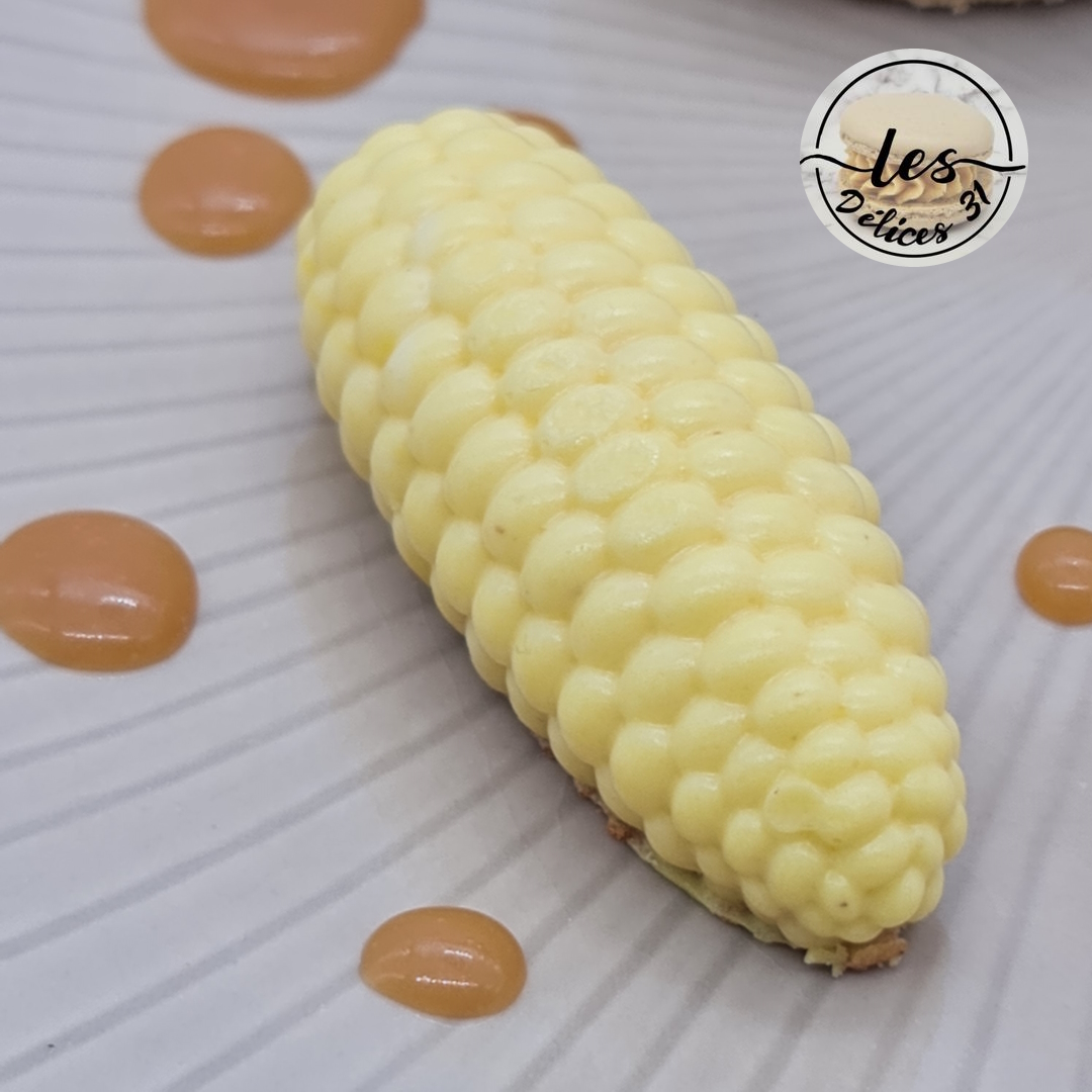 Remplir le moule épis de maïs avec le restant de mousse popcorn. Déposer le biscuit vanille recouvert de caramel et placer également au congélateur.