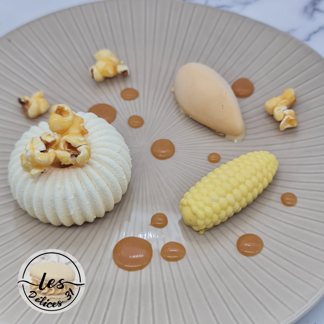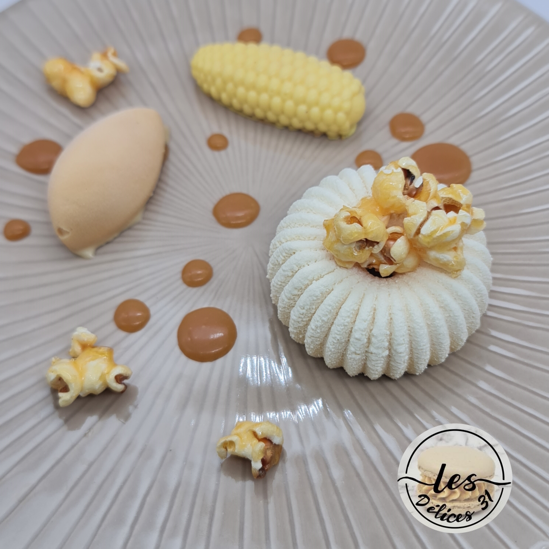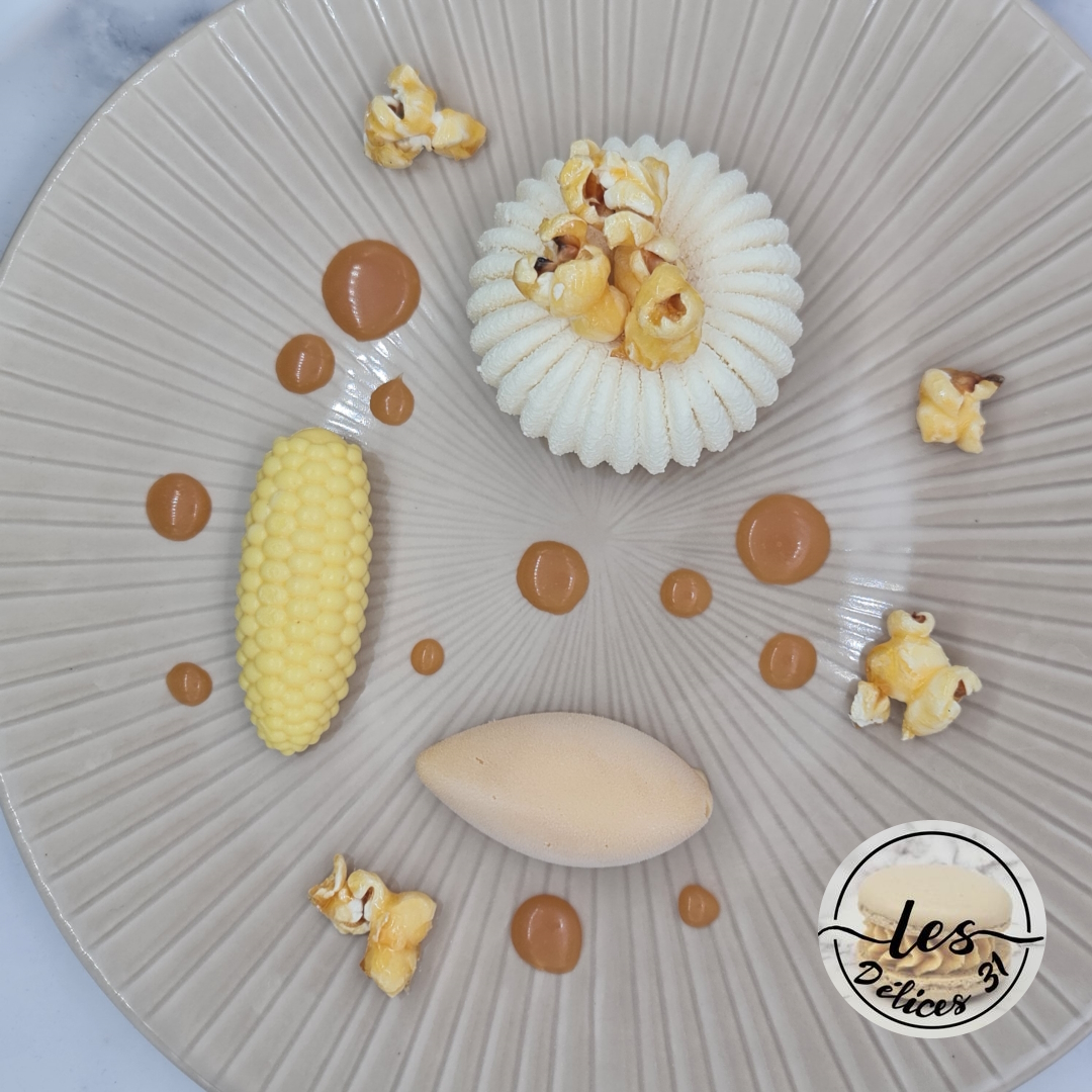 – d’un biscuit vanille popcorn, – de caramel, – d’une mousse popcorn, – de spray velours blanc, – d’une quenelle de glace caramel, – de popcorns caramélisés.