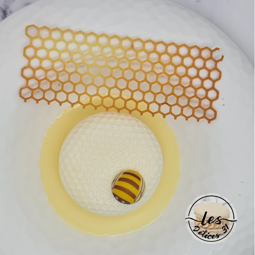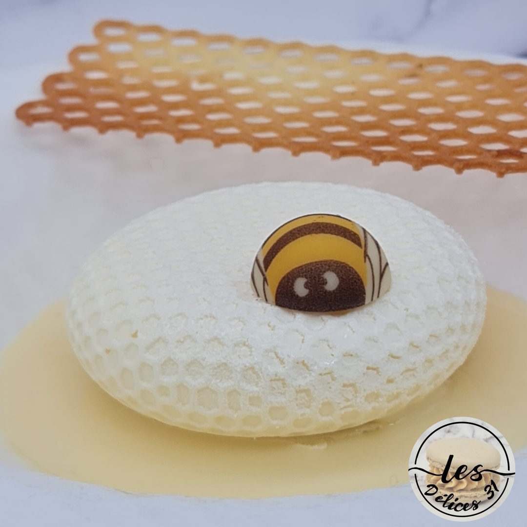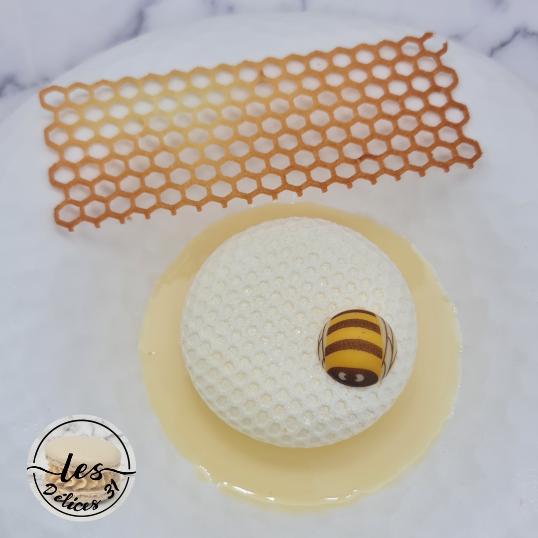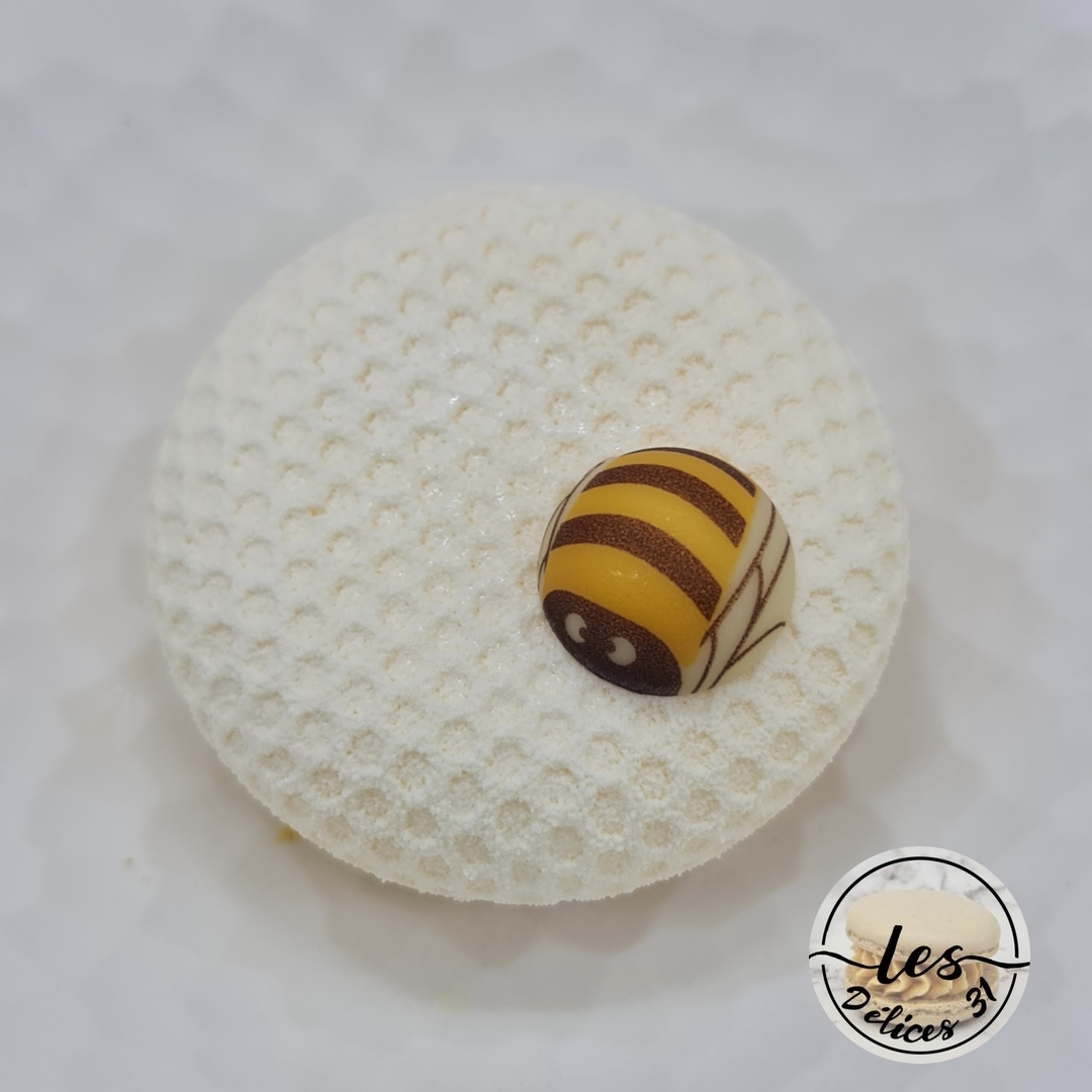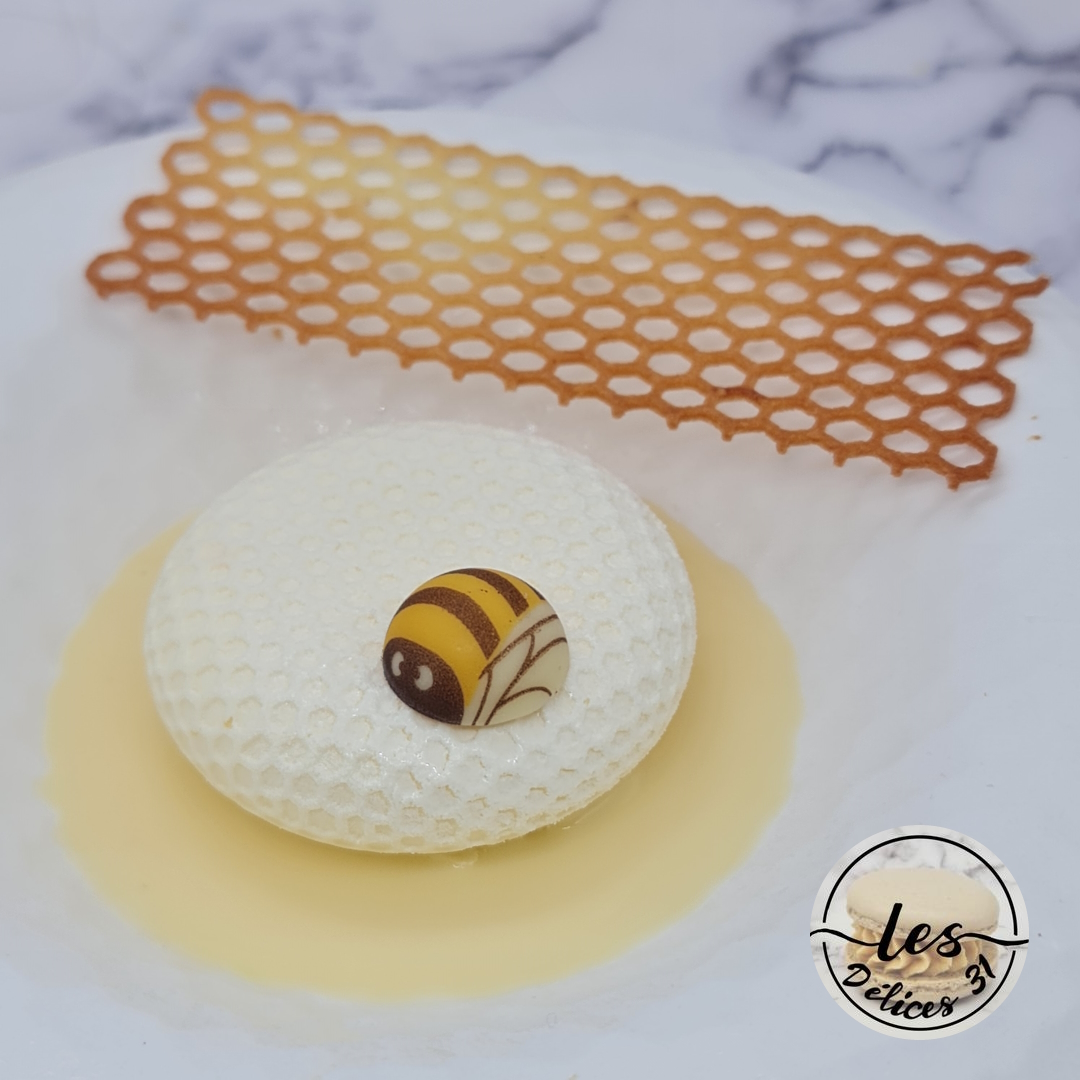 Déposer sur votre biscuit votre entremet. J’ai décoré d’une abeille en chocolat. J’ai versé tout autour de la crème anglaise au citron.