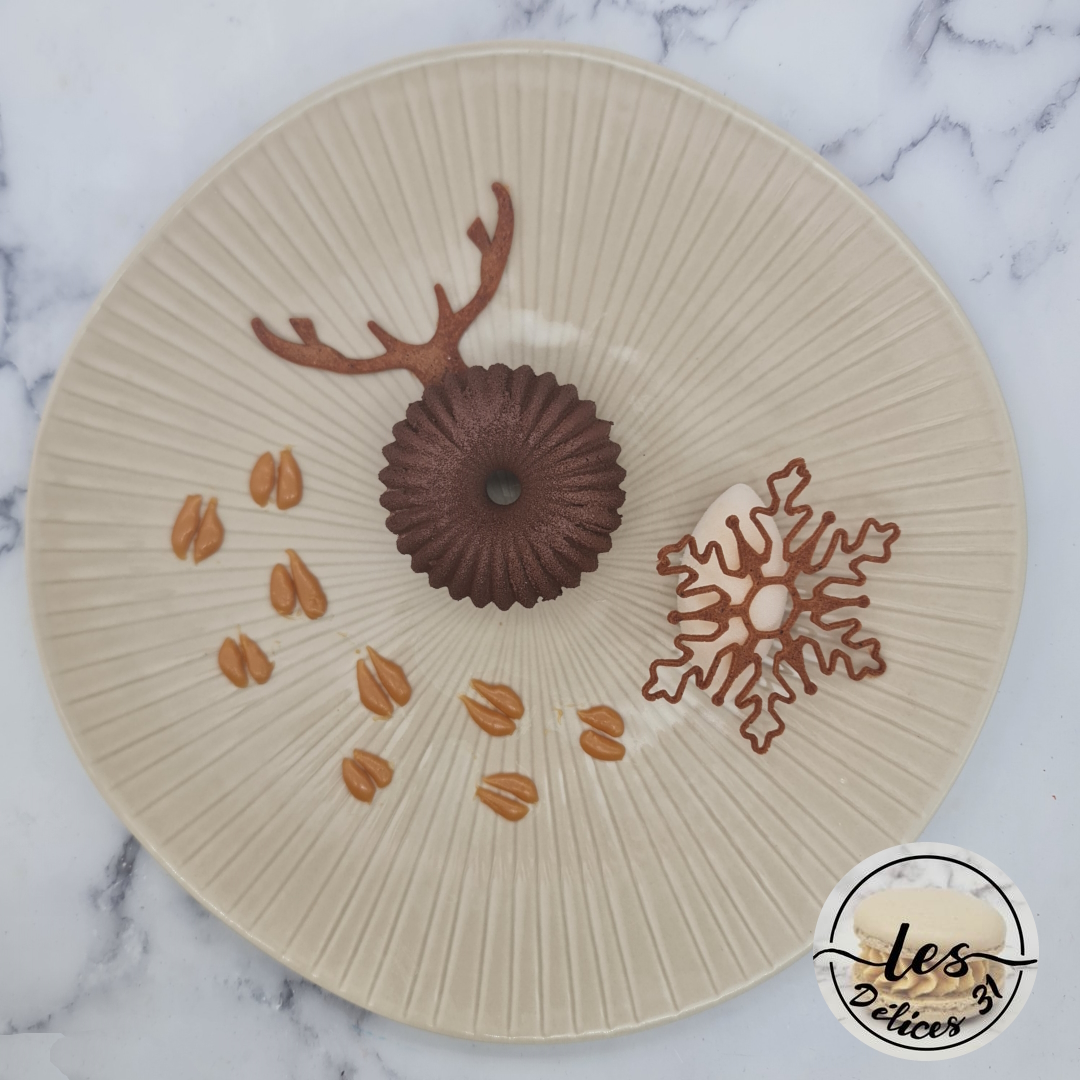 Entremet renne composé – d’une mousse marron, – d’une compotée de poire, – d’un spray velours brun, – de caramel maison, – d’une quenelle de sorbet poire, – d’une tuile décorative.