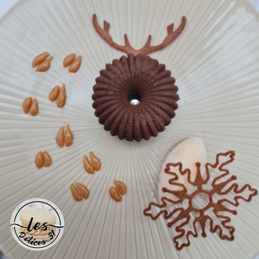 Mélanger l’ensemble des ingrédients. Garnir le Moule tuile flocon et le moule bois cerf. Lisser avec une spatule coudée pour retirer l’excédent. Enfourner à four chaud 170°C pendant 6 -8 minutes (peut varier suivant votre four). Dès la sortie du four, démouler. Attention ils durcissent très vite et deviennent cassants. Manipuler délicatement.