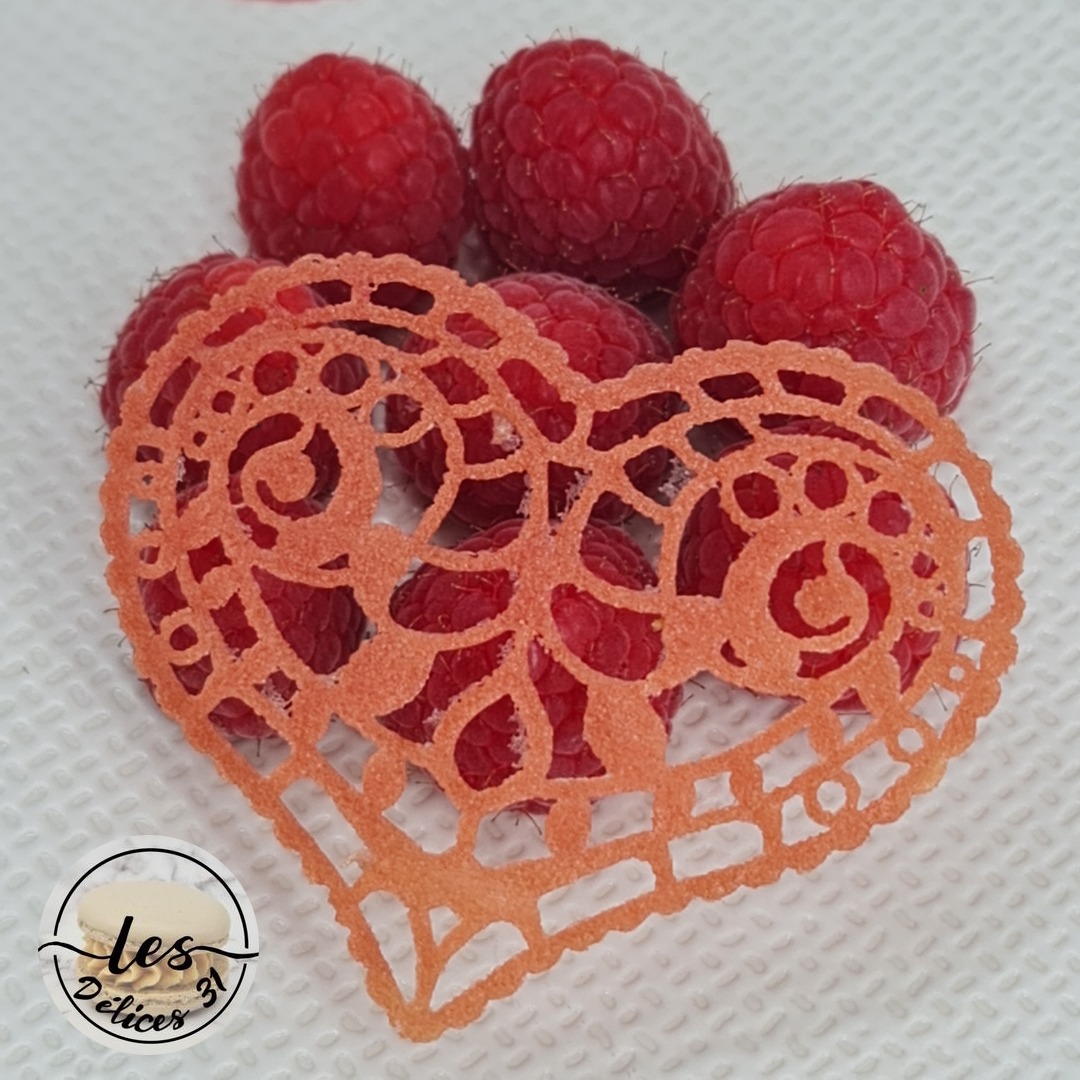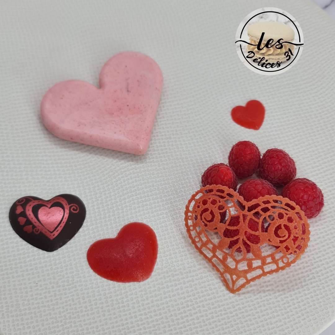 Sortez vos entremets du congélateur. Démoulez les cœurs. Placez votre cœur sur votre assiette de service. Déposez vos cœurs en gelée, des framboises fraiches et un cœur en chocolat (trouvé sur le site annikids.com). Placez au frais jusqu’au dessert. Juste avant de servir, ajoutez votre tuile.