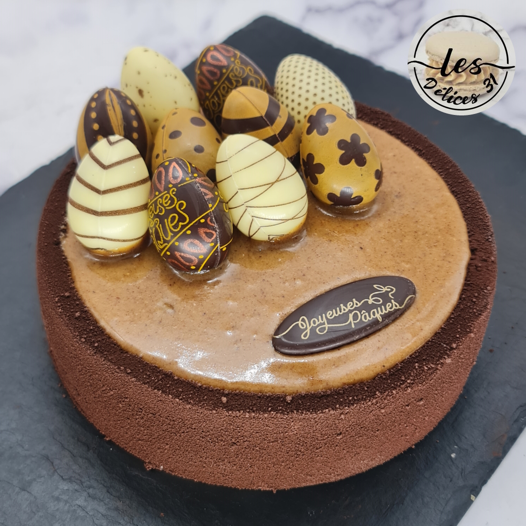 Mix praline, melted white chocolate and crumbled crêpes dentelles. Roll out between two sheets of parchment paper and freeze for a few minutes. Using a cookie cutter, cut out circles smaller in diameter than your mold. Set aside in the freezer until ready to assemble.