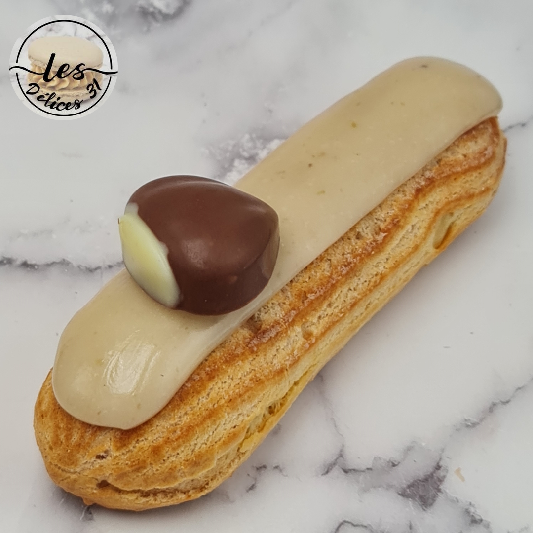 Garnir les éclairs avec la crème pâtissière. Déposer le fondant sur chaque éclair. J’ai décoré les éclairs d’une petiote feuille d’or alimentaire et d’un marron avec une coque en chocolat et garni de crème de marron.