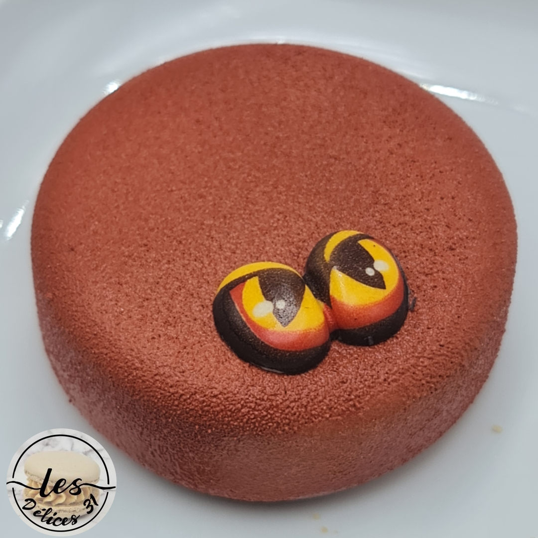 Le lendemain démouler vos entremets et appliquer aussitôt le spray velours caramel.