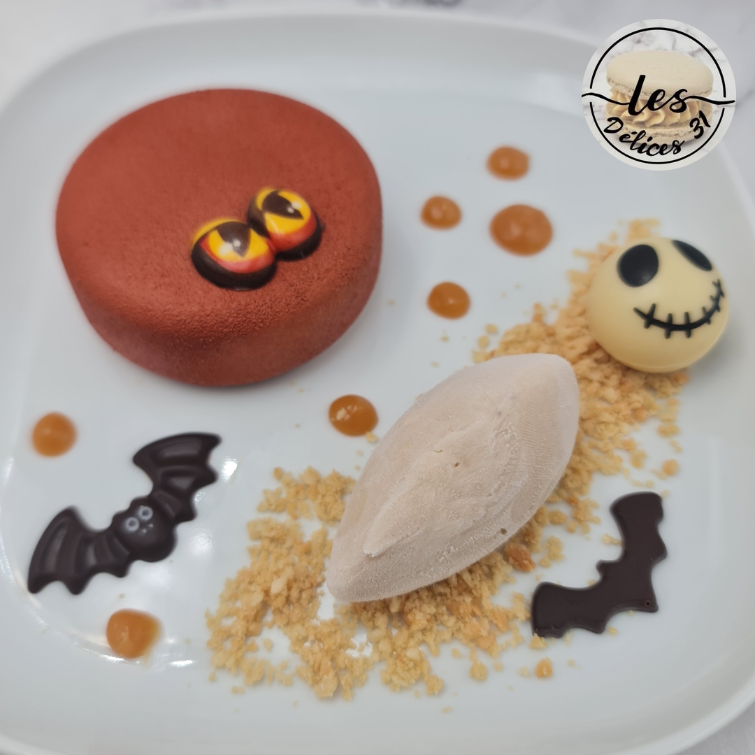 – d’une mousse cacahuète, – d’un croustillant cacahuète, – d’un praliné cacahuète, – de spray velours caramel, – de poudre de cacahuète, – d’une quenelle de glace cacahuète, – de caramel.