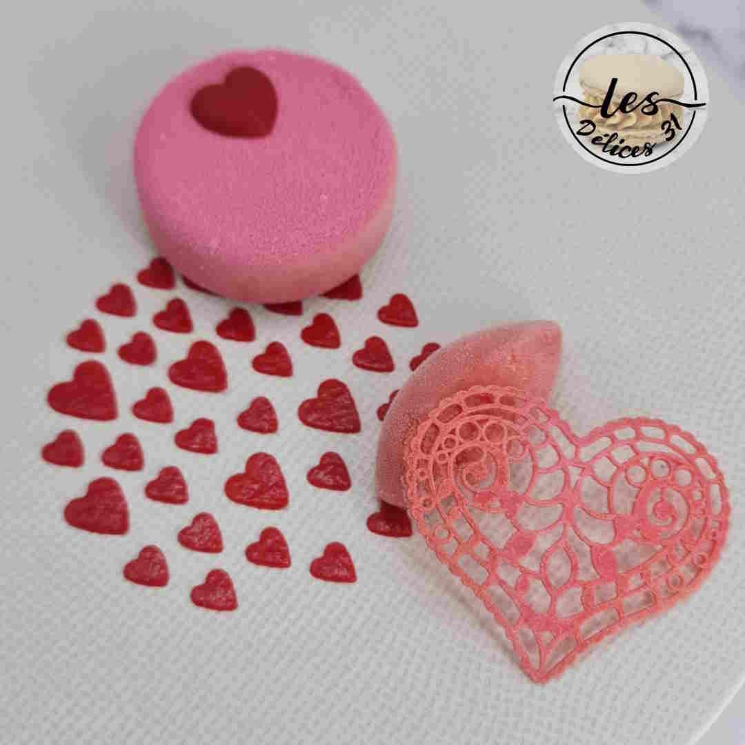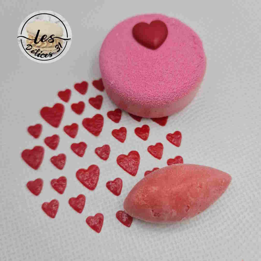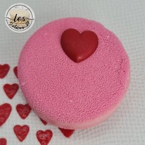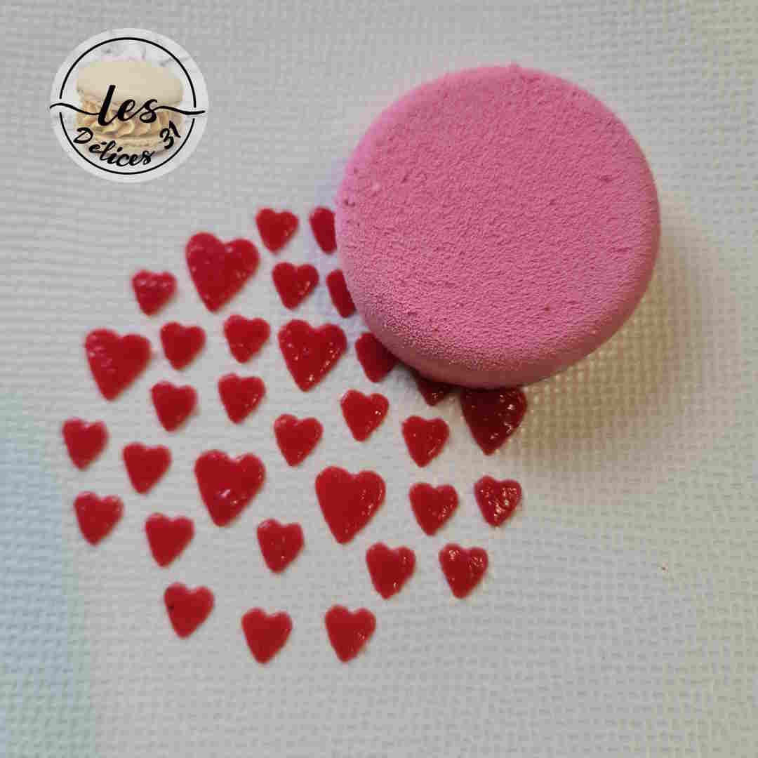 Le lendemain, démouler vos entremets et appliquer aussitôt le spray velours rose.