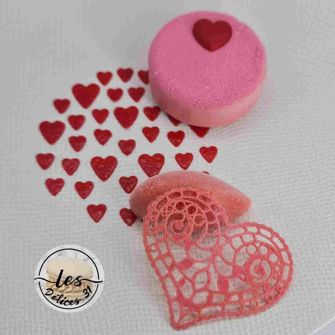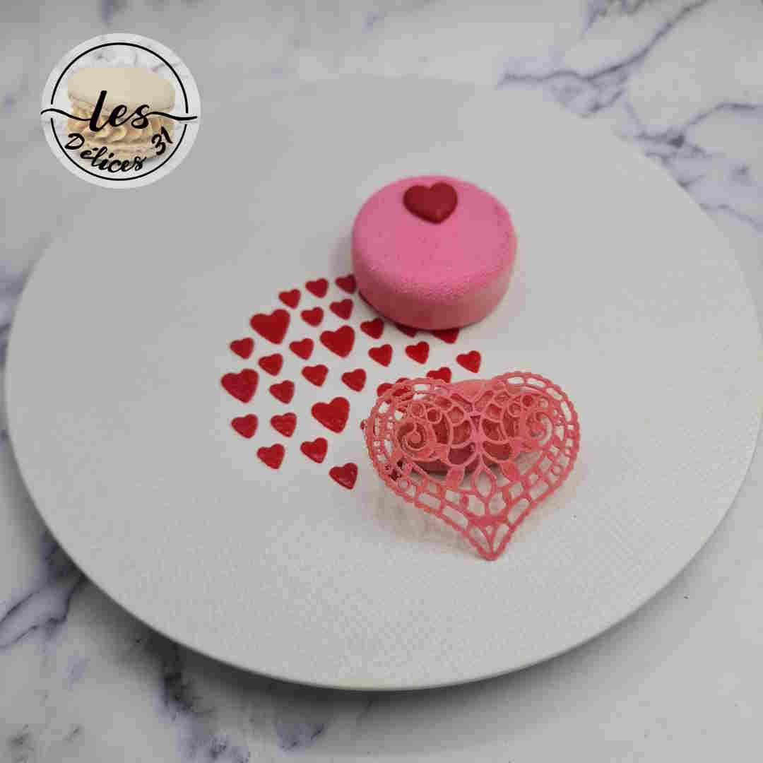 Déposer sur votre assiette de service votre entremet. J’ai ajouté un coeur en chocolat trouvé sur le site annikids.com