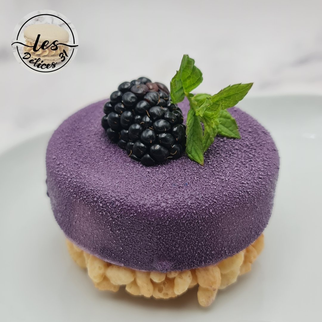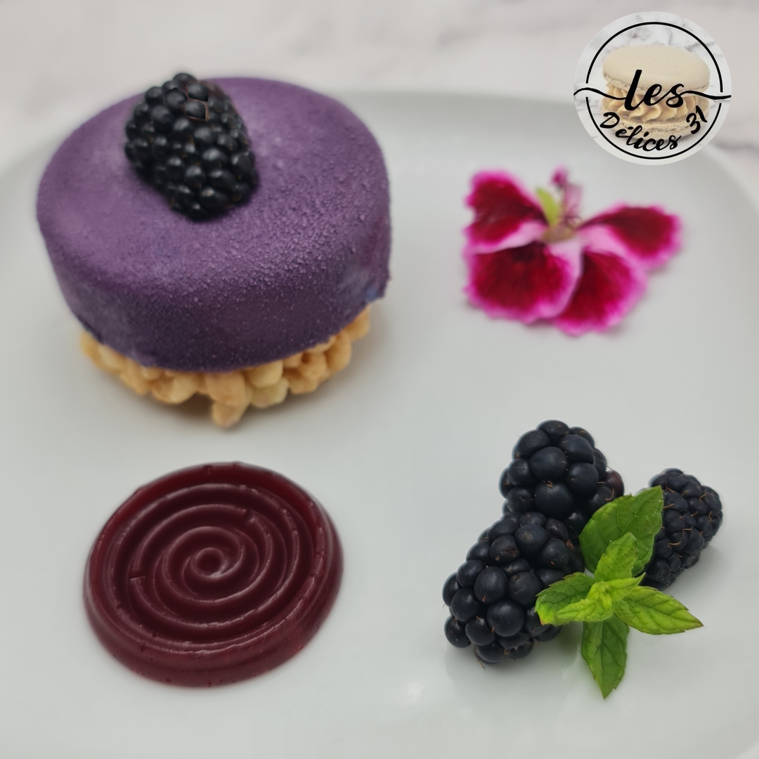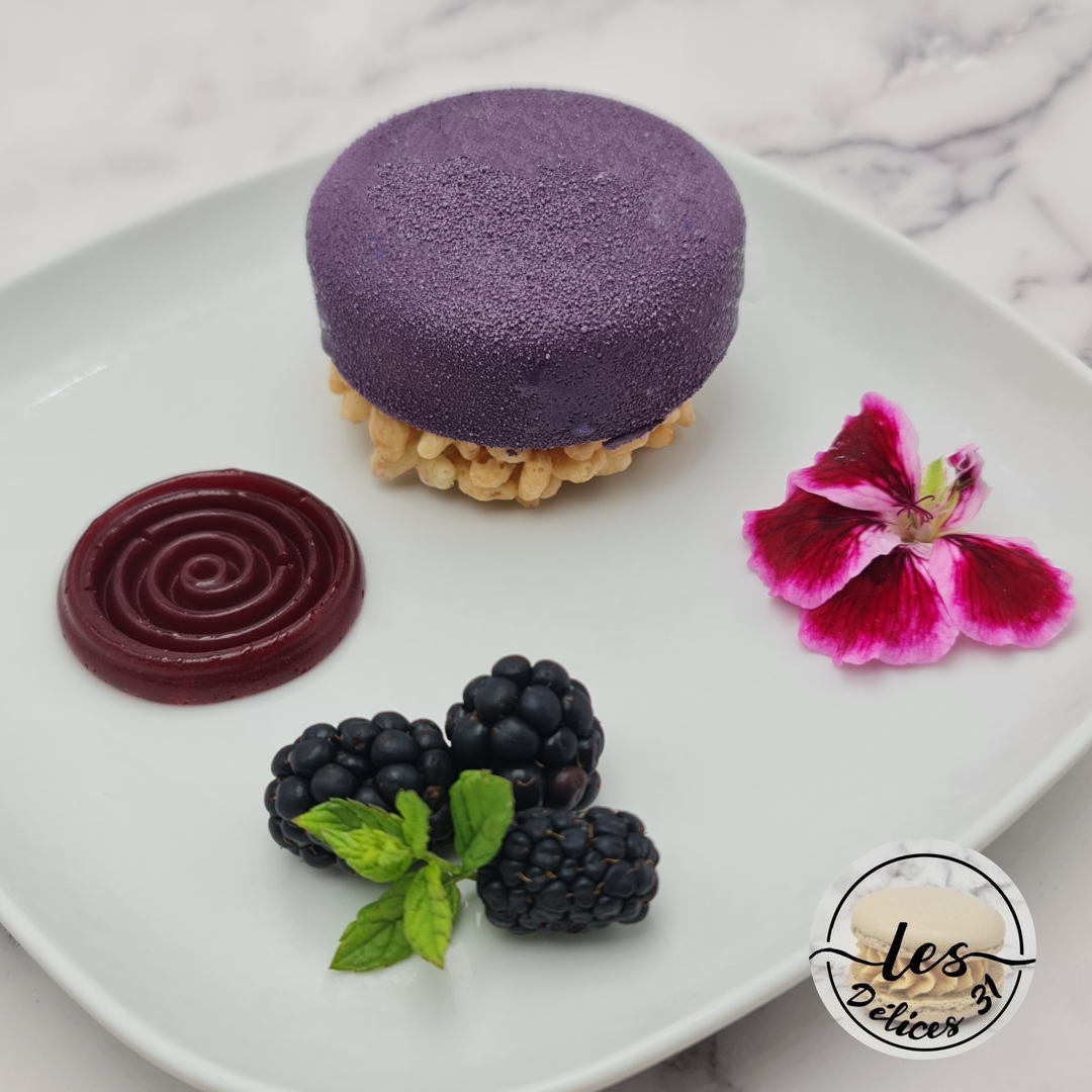 Déposez l’entremet sur votre assiette et la gelée de mûres.