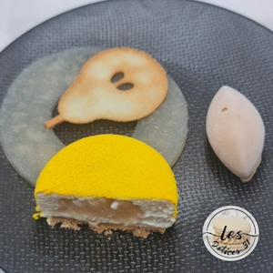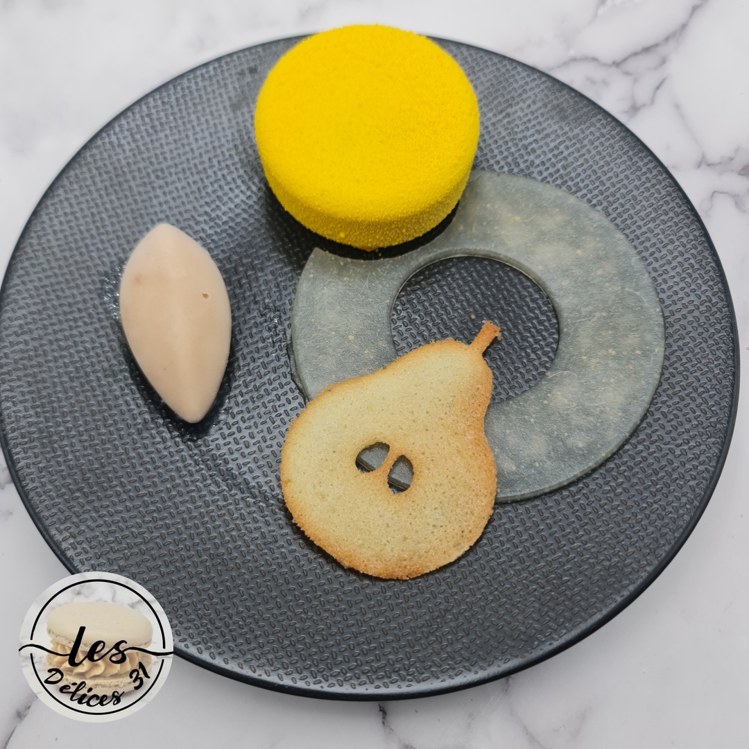 Dans une casserole, verser la poire pelée et mixée et faire chauffer en remuant de temps en temps. Dès le début de l’ébullition, couper le feu et ajouter la gélatine essorée et bien ramollie. Mélanger puis verser dans votre moule en silicone (J’ai utilisé un moule en silicone de la marque Pavoni). Placer au frais le temps que la gélatine fasse effet puis au congélateur (afin de faciliter le démoulage).