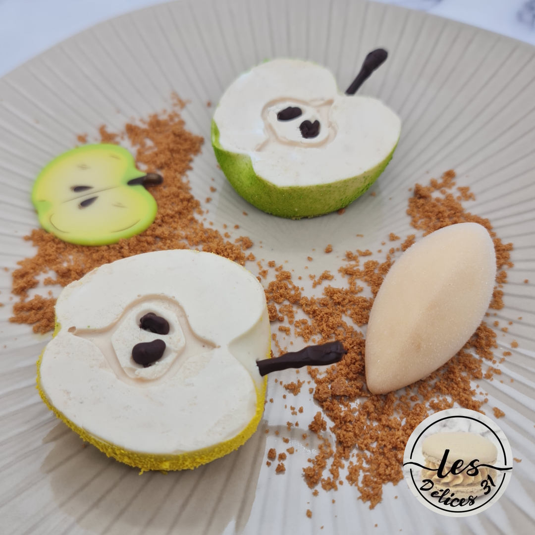 Sur un morceau de papier cuisson, venir pocher le restant de chocolat dessus pour former les queues des pommes et saupoudrer à nouveau dessus un peu de cacao en poudre. Laisser prendre au froid. Insérer la queue dans l’entremet quand celui-ci a un peu décongelé. Conserver au frais jusqu’à la dégustation.