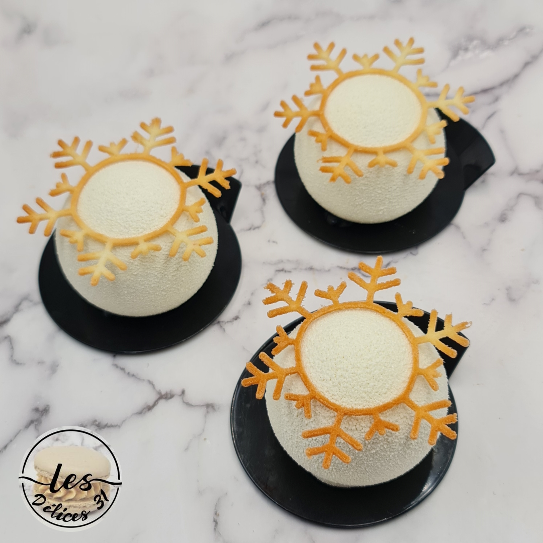 Le lendemain, démouler les entremets congelés et appliquer aussitôt le spray velours blanc.