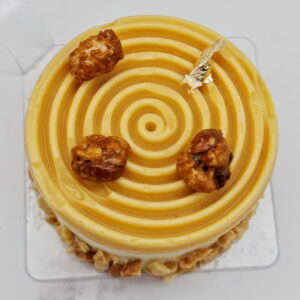 Démouler votre entremet, déposer le crémeux sur le dessus. Déposer des cacahuètes hachées tout autour. Sur le dessus, j’ai déposé quelques chouchous maison (cacahuètes pralinées) et une feuille d’or alimentaire. Placer au réfrigérateur le temps de la décongélation.