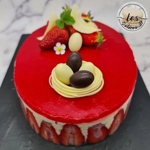 J’ai décoré le fraisier avec des fraises, des œufs en chocolat, des fleurs et feuilles de fraises.