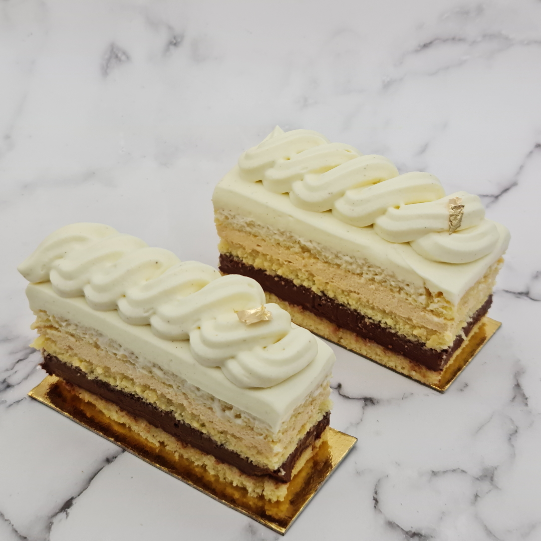 Déposer au fond de votre rectangle à pâtisserie, un premier biscuit joconde imbibé de sirop (sucre, eau, rhum). Versez le crémeux chocolat puis le deuxième biscuit imbibé. Sortez votre crémeux caramel du frigo et détendre la préparation au batteur. Pocher le crémeux sur le biscuit. Recouvrir du troisième biscuit imbibé de sirop. Sortez le crémeux vanille et mélangez celui-ci au batteur électrique. Versez à hauteur du moule et lissez à la spatule (conserver du crémeux vanille pour pocher sur le dessus). Placez au frais. Quand le crémeux a pris, pochez sur le dessus le restant de crémeux vanille et décorer d’une petite feuille d’or.