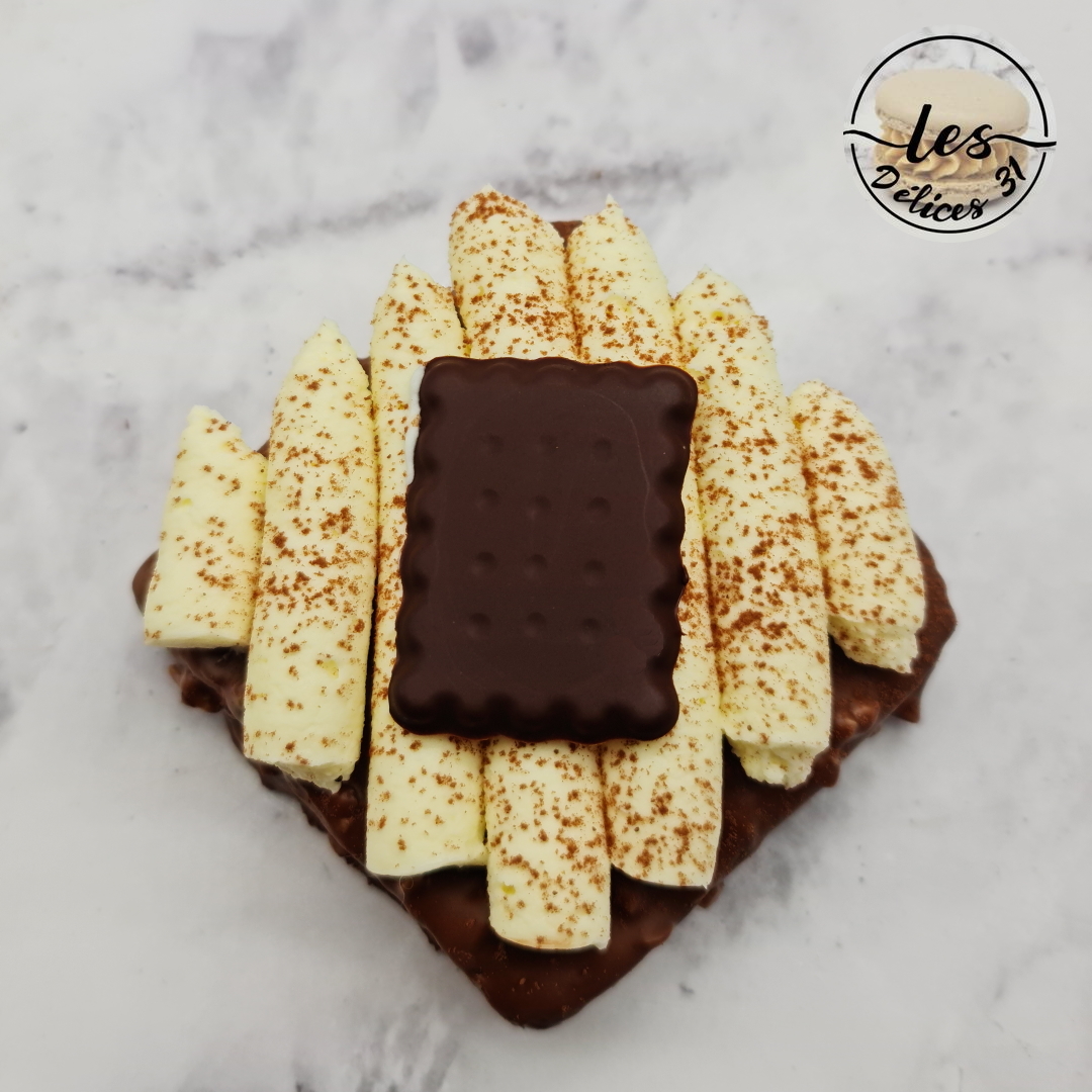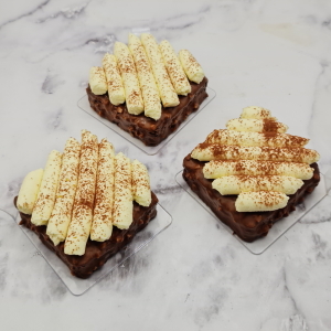 Montage Ressortir votre ganache chocolat blanc du frigo et la monter à l’aide d’un batteur électrique. Garnir une poche à douille munie d’une douille unie de votre ganache et pocher celle-ci sur vos brownies. Saupoudrer de cacao en poudre et décorer d’un carré de chocolat noir. Placer au frais jusqu’à la dégustation.