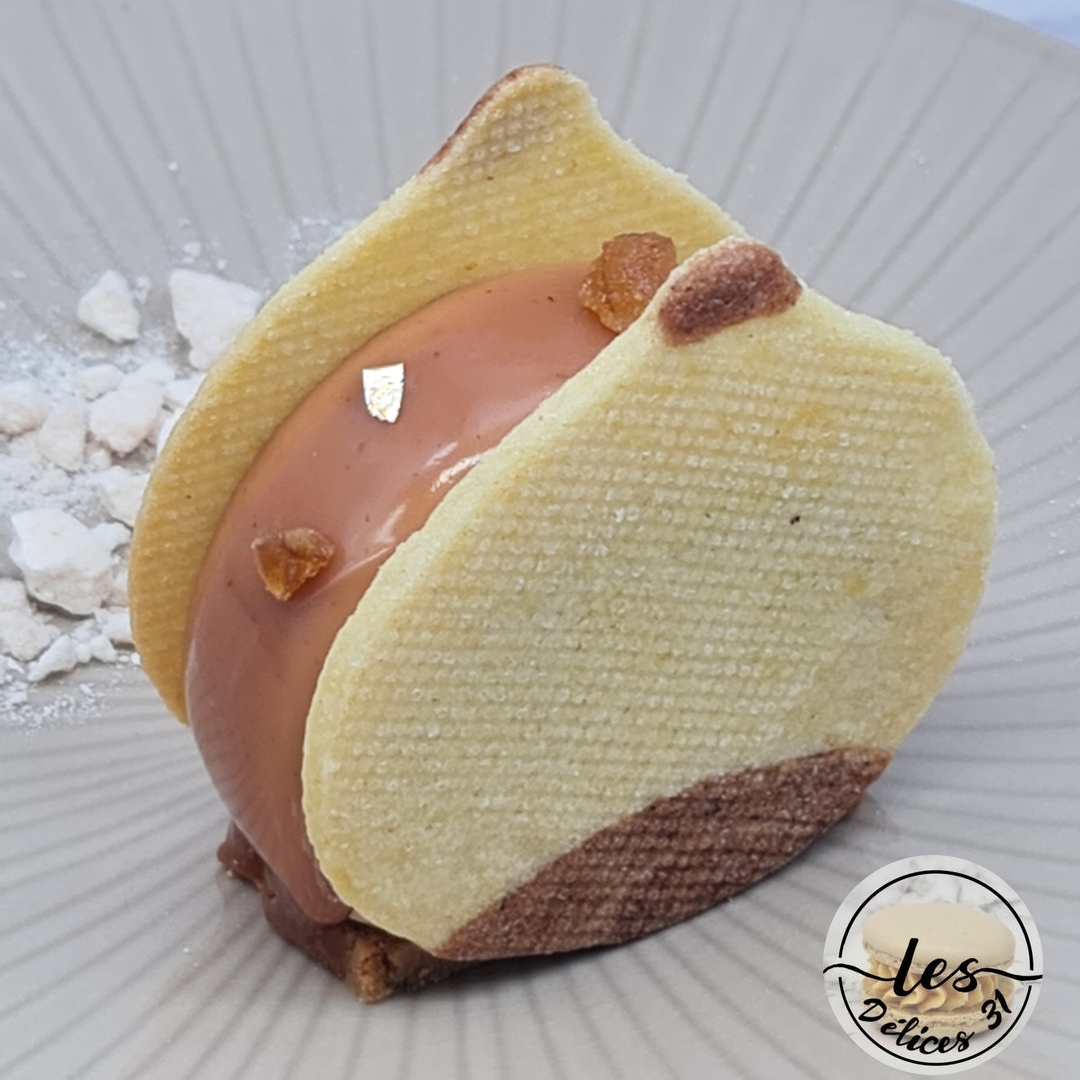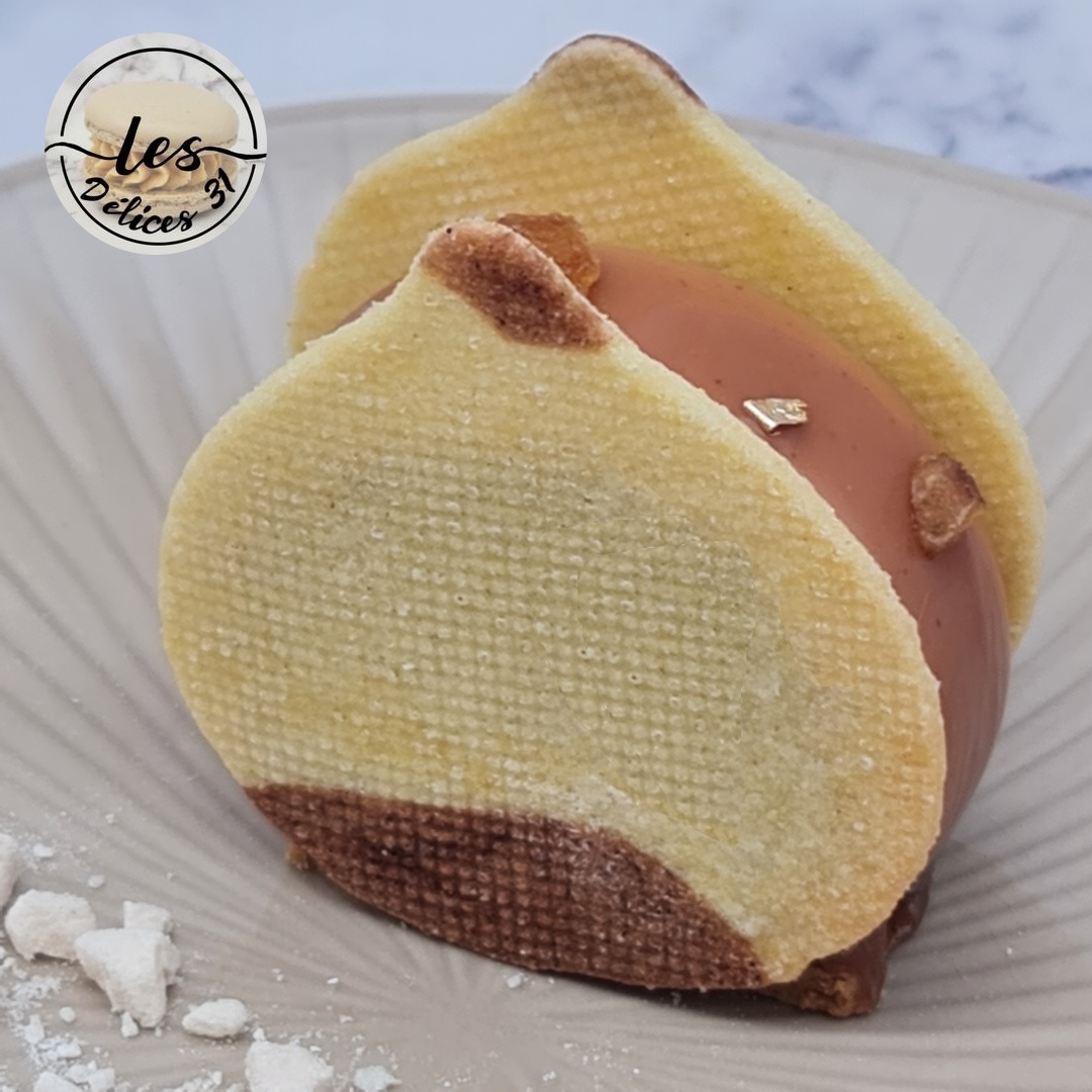 Mélanger dans un saladier l’ensemble des ingrédients. Prélever une petite quantité de pâte à laquelle vous ajoutez un peu de cacao en poudre. Etaler entre deux feuilles de papier cuisson en plaçant un peu de pâte cacao. A l’aide d’un emporte pièce venir découper votre pâte en forme de marron. Poser sur une plaque de cuisson recouverte d’un tapis de cuisson micro-perforé puis placer au congélateur 10 minutes le temps de préchauffer votre four à 170°C. Cuire entre 2 tapis de cuissons. Laisser refroidir et réserver de côté pour le montage.