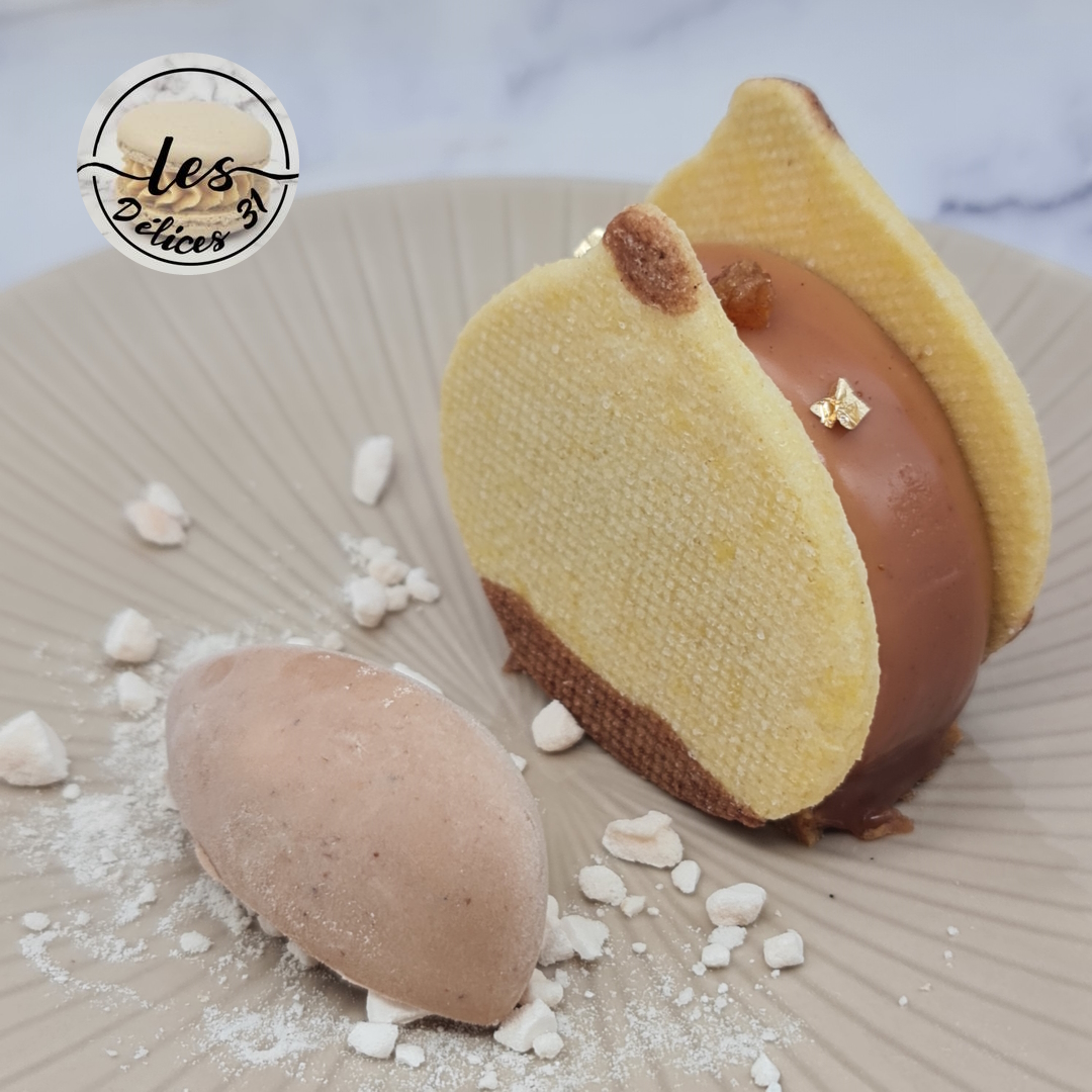 Juste avant de servir, procéder au dressage. Déposer votre entremet. Emietter de le meringue. Venir juste avant de servir déposer votre quenelle de glace aux marrons préalablement moulée dans le moule silikomart quenelle.