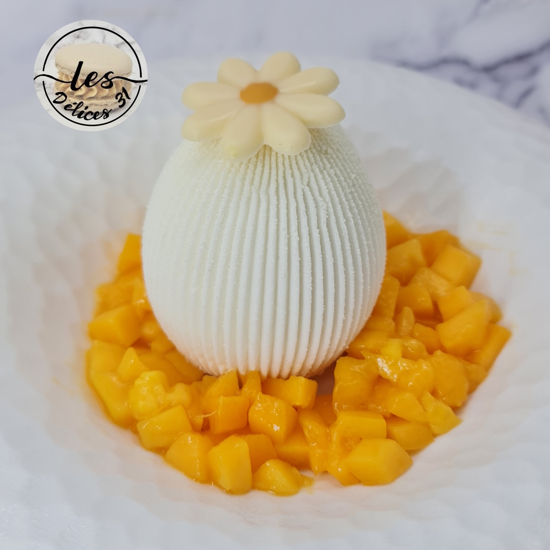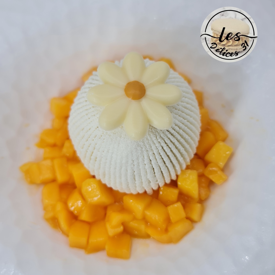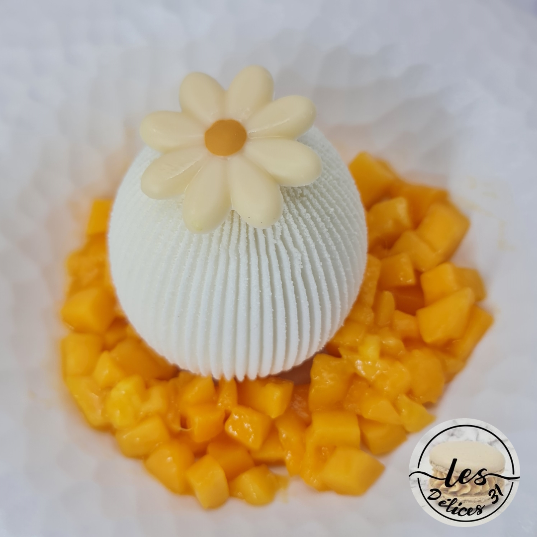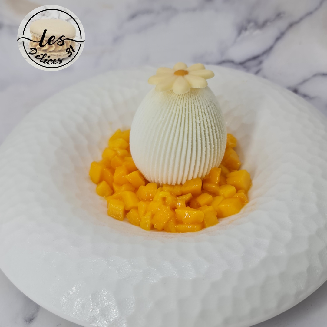 – d’un biscuit dacquoise coco, – d’un insert de mangue et fruits de la passion, – d’une mousse noix de coco, – de spray velours blanc, – de dés de mangue.