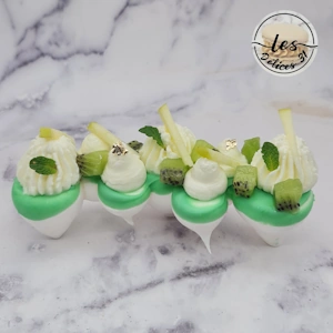 Faire fondre un peu de chocolat blanc avec du colorant vert liposoluble et venir plonger sur 5mm à 1cm la meringue dedans.