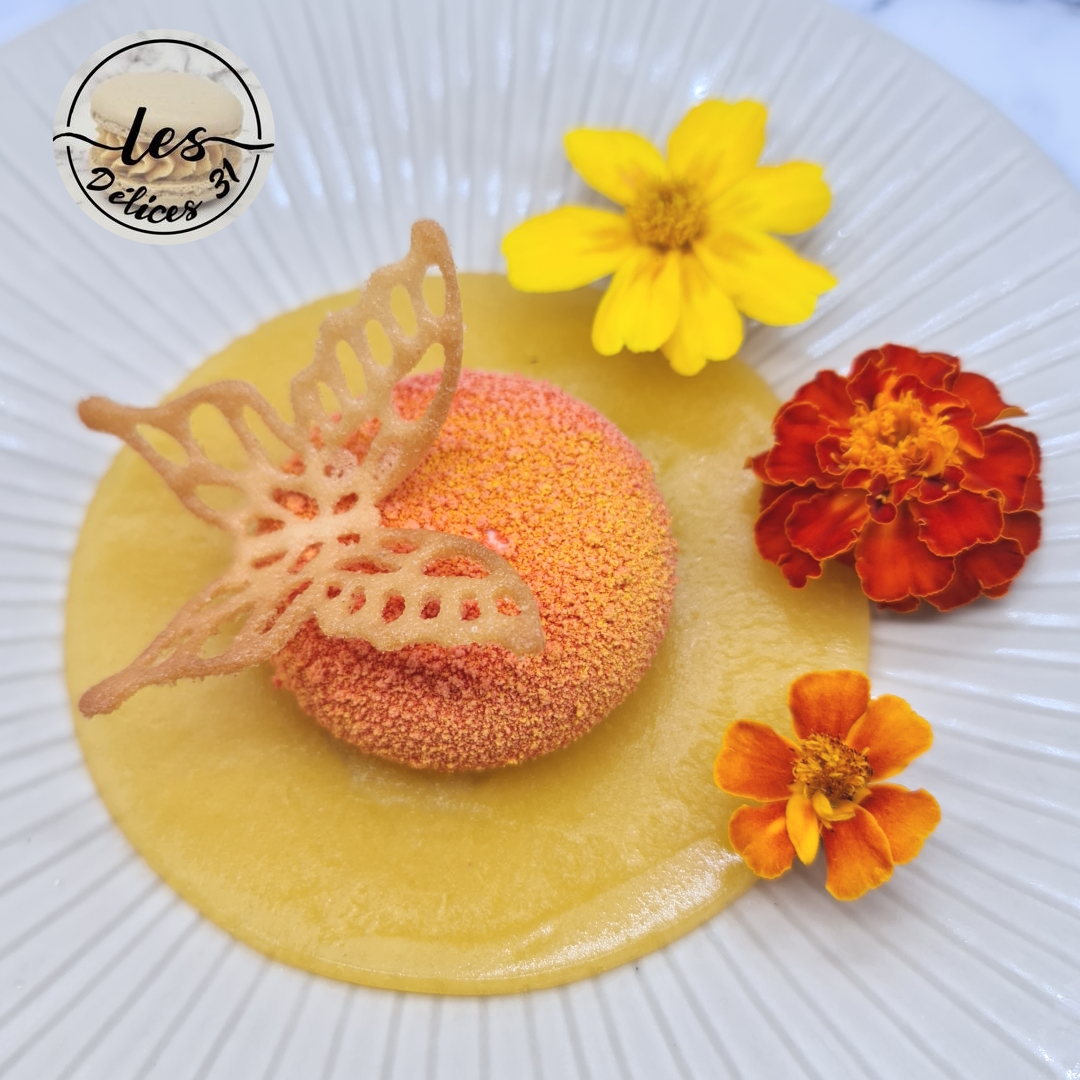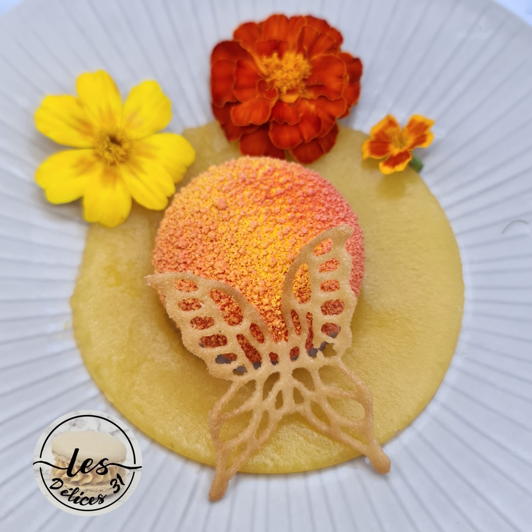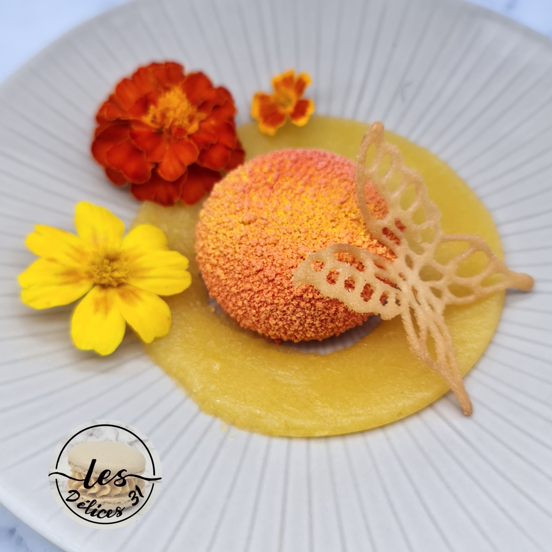 The next day, remove the peach desserts from their moulds and immediately apply the yellow and orange velvet spray.