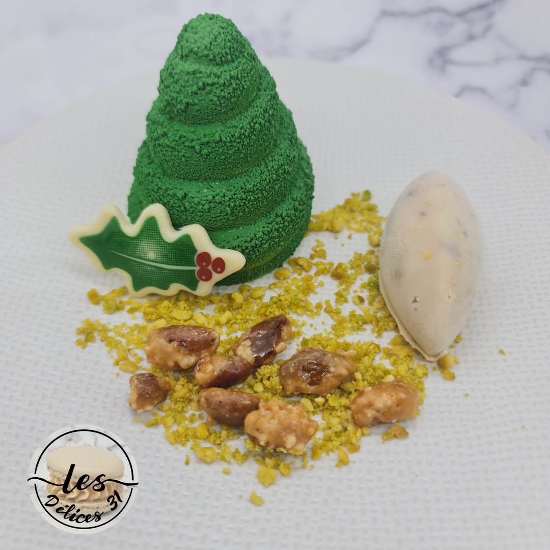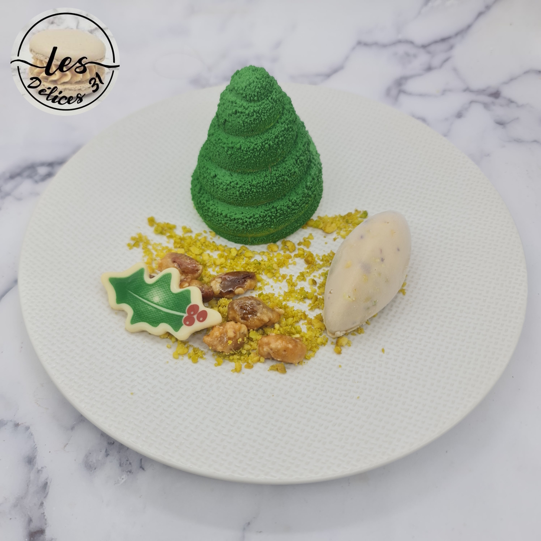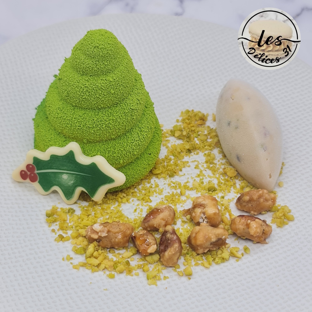 – d’un croustillant pistache, – d’un insert kadaïf pistache, – d’une mousse pistache, – d’un spray velours vert, – d’une quenelle de glace pistache, – de pistaches caramélisées, – de poudre de pistaches.