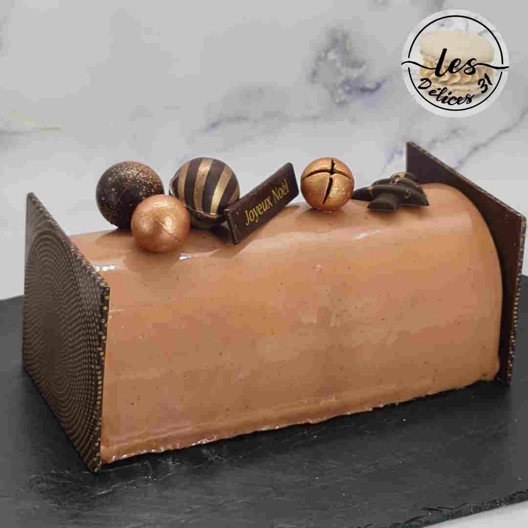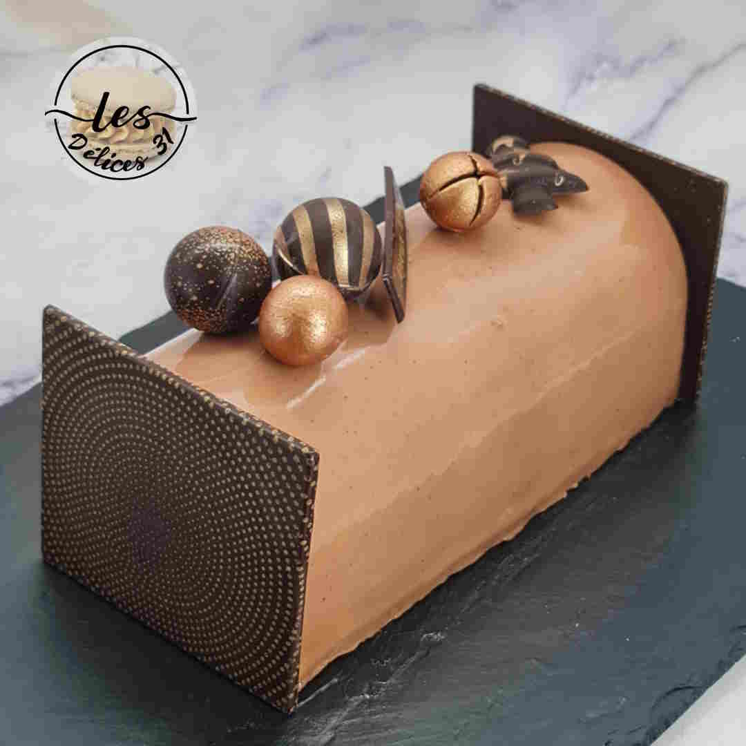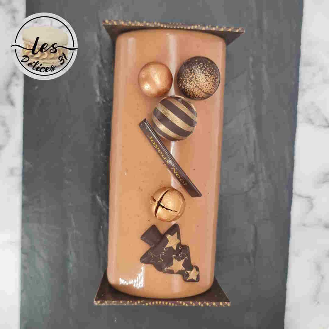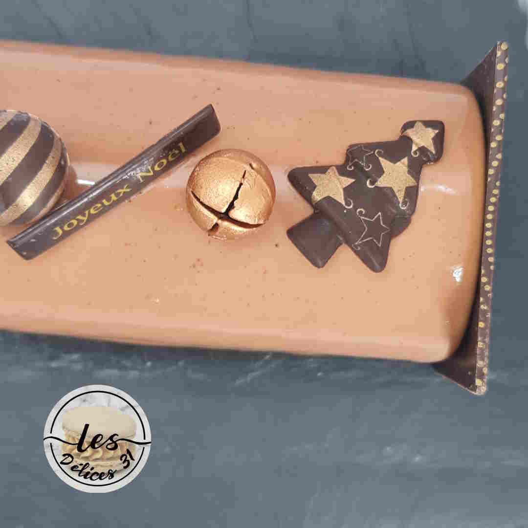 Le lendemain, démouler la buche et appliquer aussitôt le glaçage miroir ramené à 35°C. Ajouter vos deux embouts de bûche et décorer votre bûche.