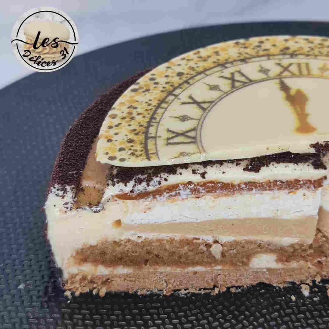 – d’un croustillant praliné, – de biscuits cuillère, – de crémeux café, – de chantilly, – de praliné noisette, – d’une mousse mascarpone, – de spray velours brun.