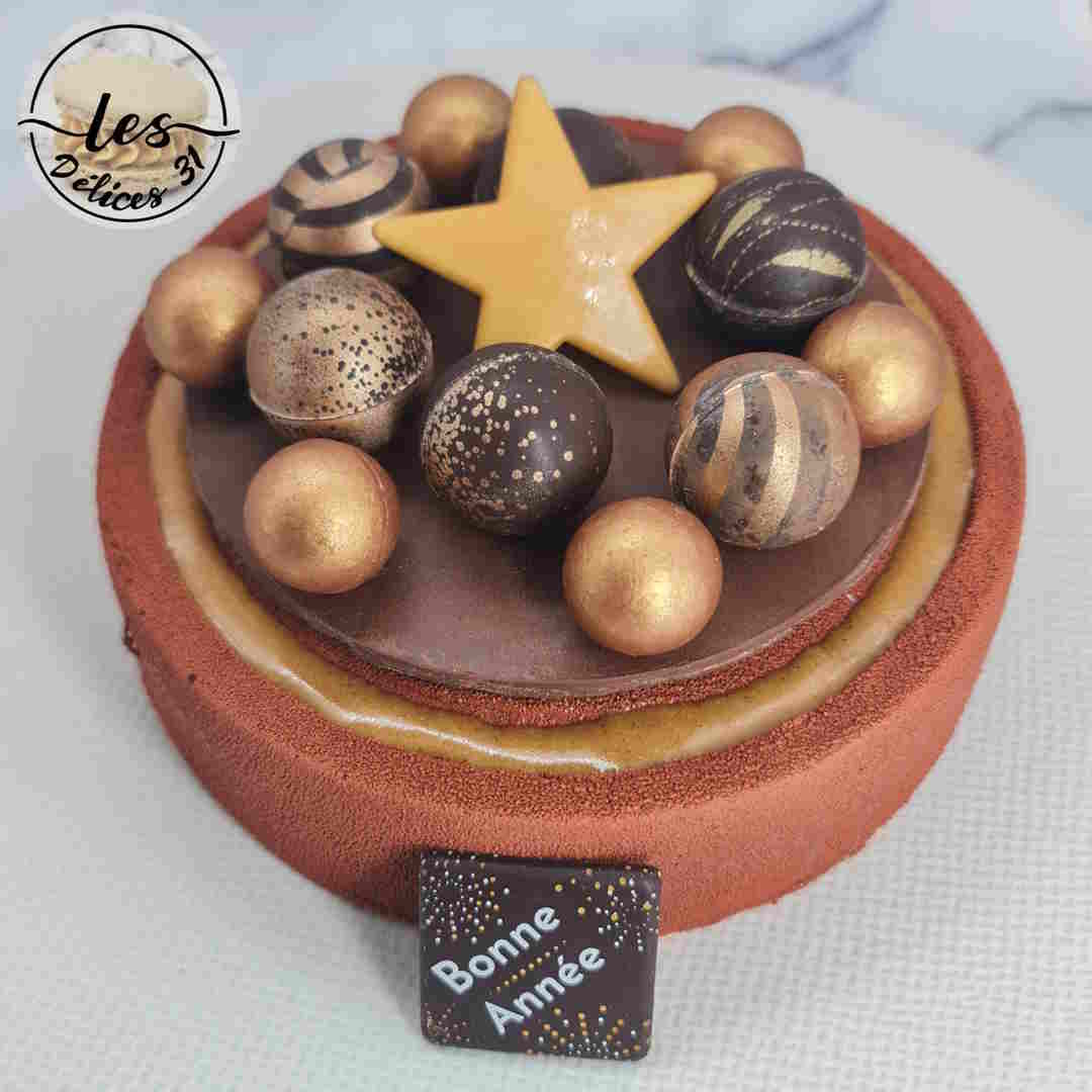 Le lendemain, démouler l’entremet. Appliquer aussitôt le spray velours caramel. Pocher un peu de praliné noisette dans la rainure.