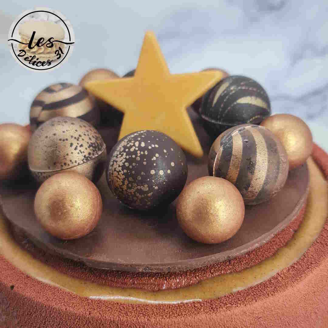 Pour la décoration, j’ai réalisé un cercle en chocolat au lait sur lequel je suis venue collée des boules (achetées sur le site Annikids.com). Placer au frais au moins 6 heures.