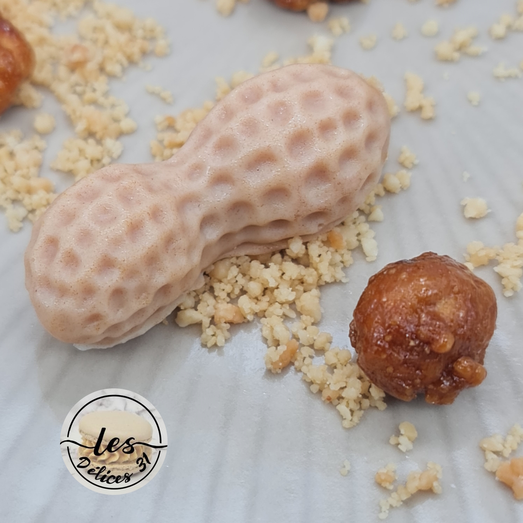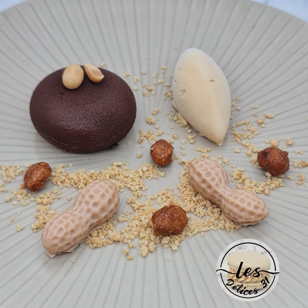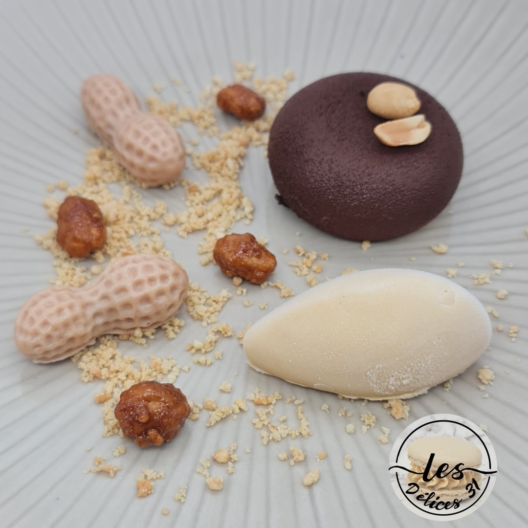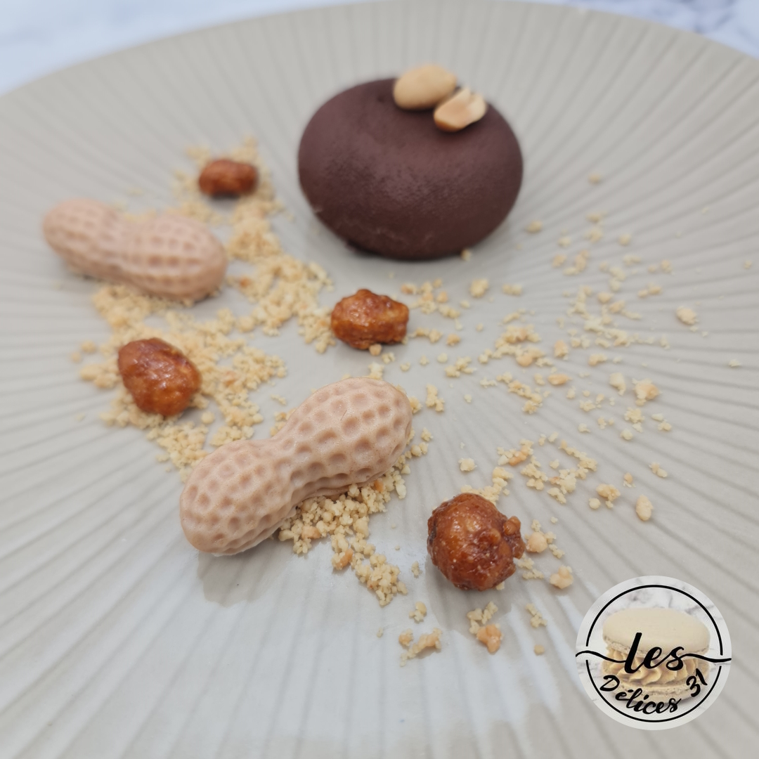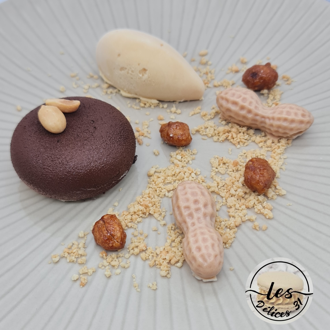 – d’une mousse vanille, – d’un croustillant cacahuète, – d’un praliné cacahuète, – de poudre de cacahuète, – d’une quenelle de glace vanille, – d’une cacahuètes caramélisées.