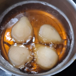 J’ai pelé, évidé et fait cuire 4 grosses poires dans une grande casserole avec de l’eau, du sucre en poudre et de la vanille liquide.