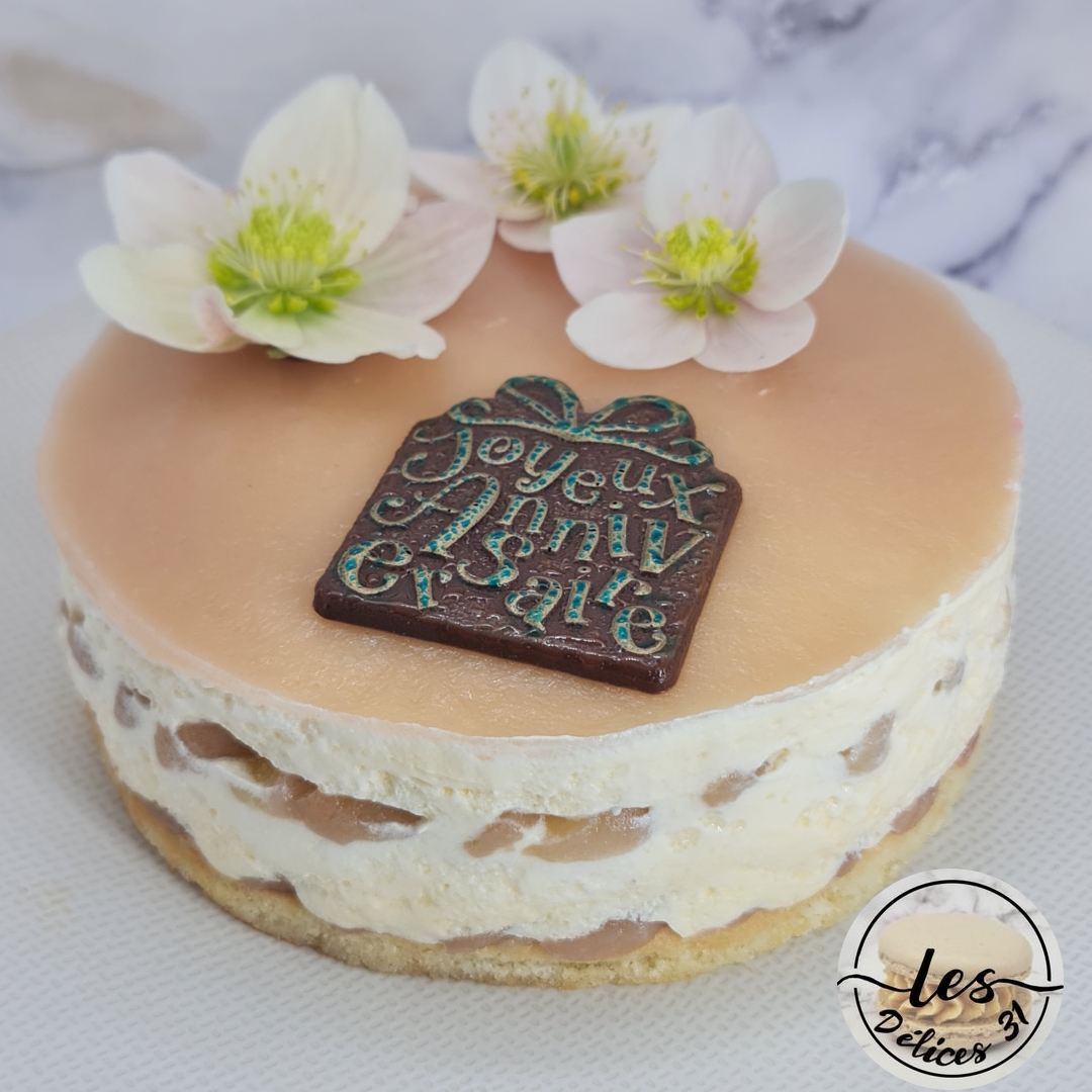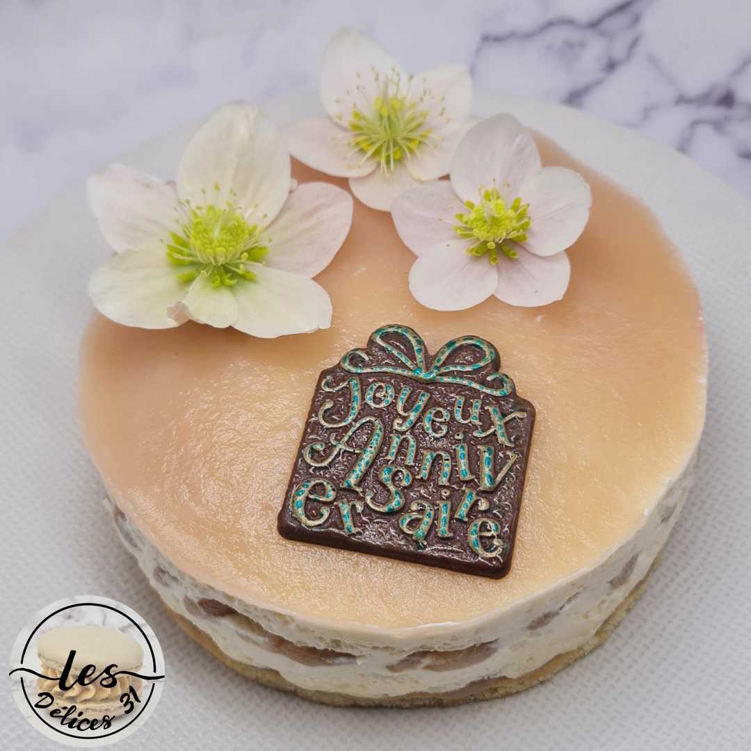 J’ai décoré avec des fleurs (rose de Noël : attention elles sont non comestibles) et une plaque en chocolat.