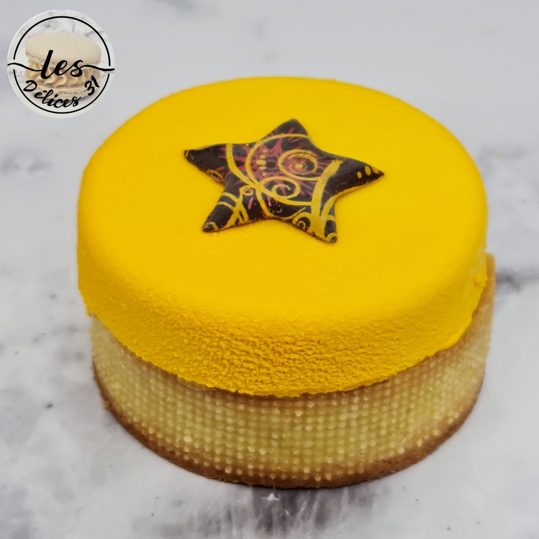 Garnir les tartelettes de crémeux citron. Sortir les dômes citron du congélateur et appliquer aussitôt le spray velours jaune. Déposer le dôme sur la tartelette. J’ai décoré avec un étoile en chocolat noir.