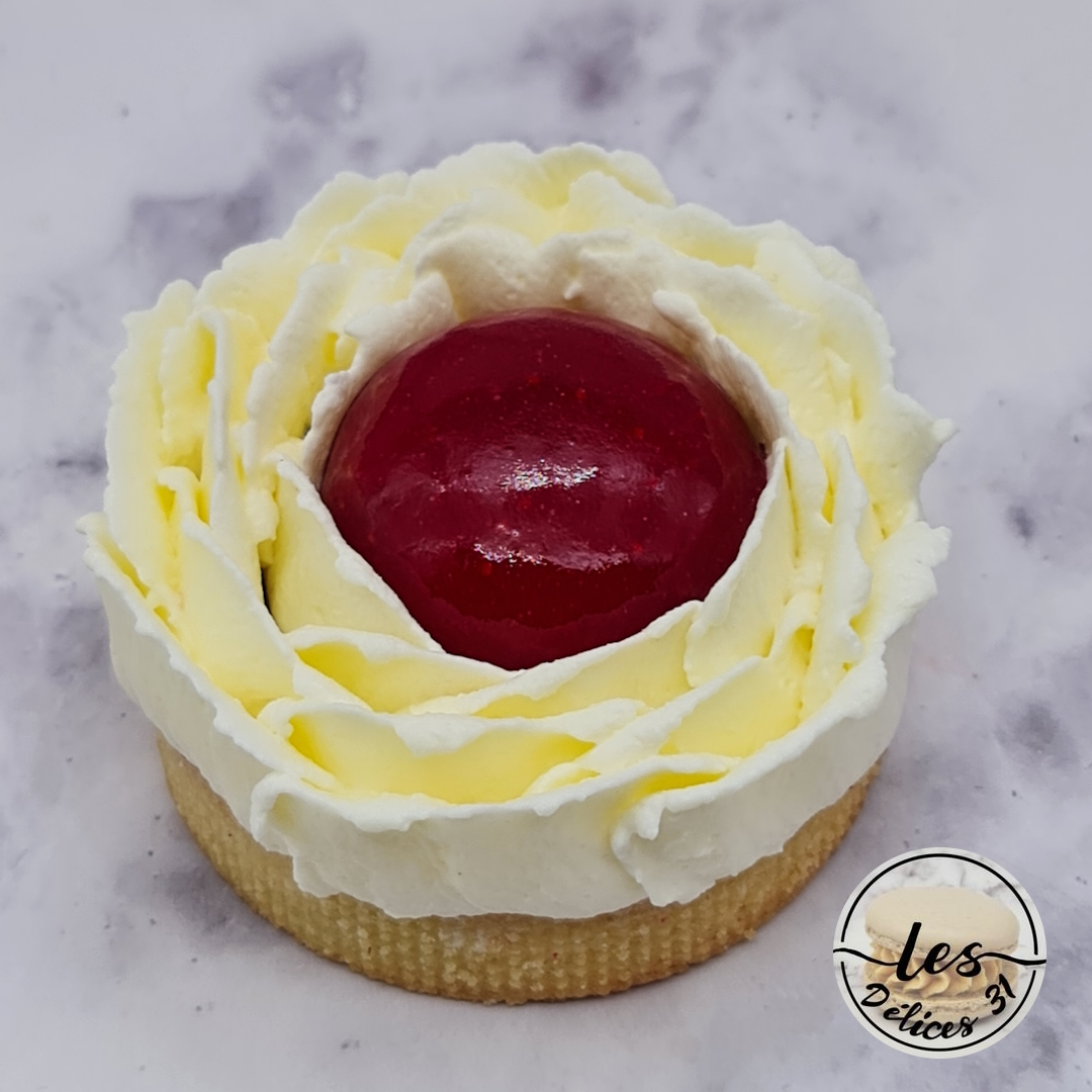 – de pâte sucrée, – d’une crème pâtissière, – d’une compotée de fraises, – d’un dôme de fraises, – d’un nappage de fraises, – d’une chantilly mascarpone.