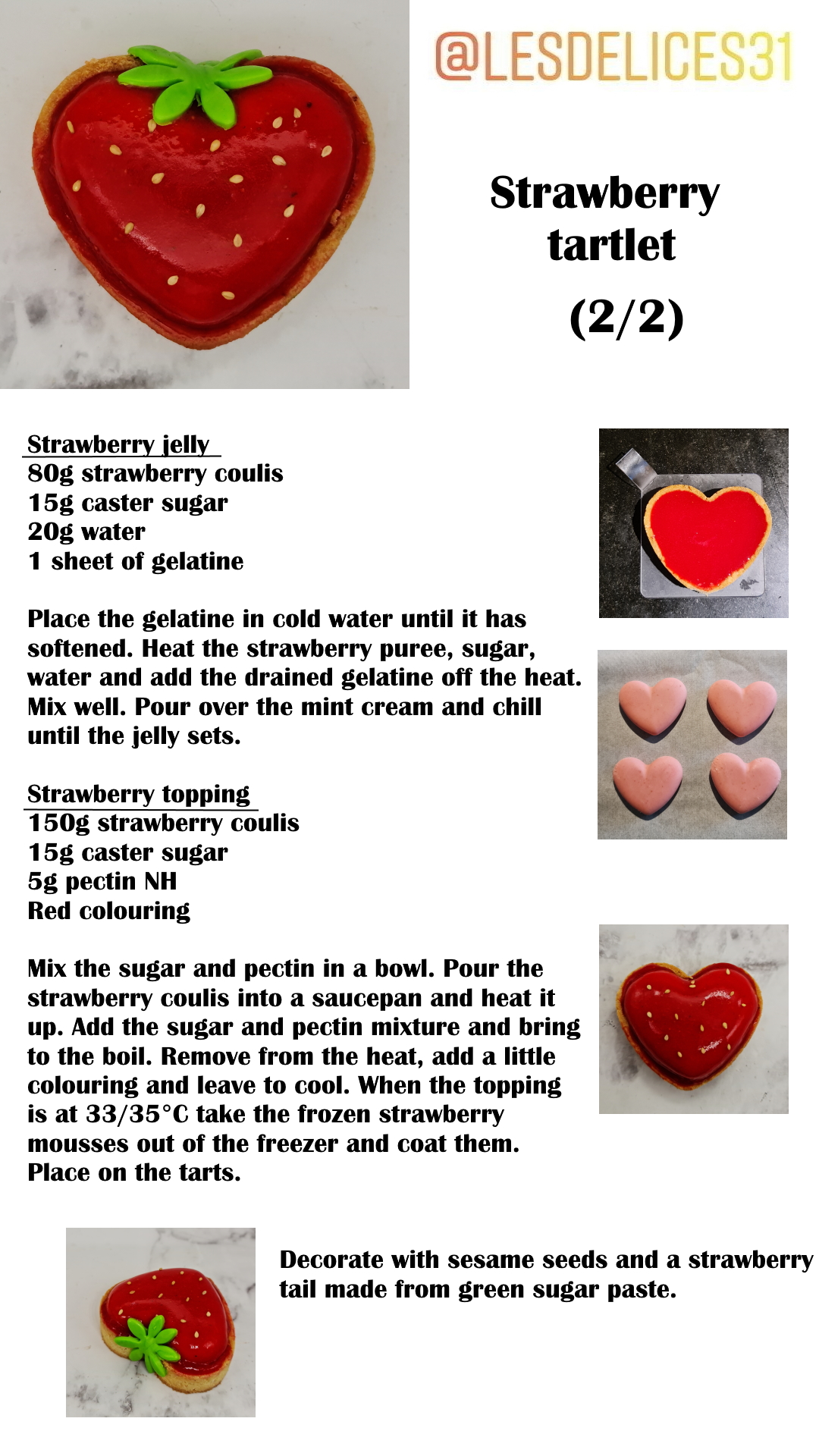 Mix the sugar and pectin in a bowl. In a saucepan, we pour the strawberry coulis and we heat it. Add the sugar and pectin mixture and bring to a boil. Remove from heat, add a little coloring and let cool. When the topping is at 33/35°C take the frozen strawberry mousses out of the freezer and coat them. Place on the tarts.